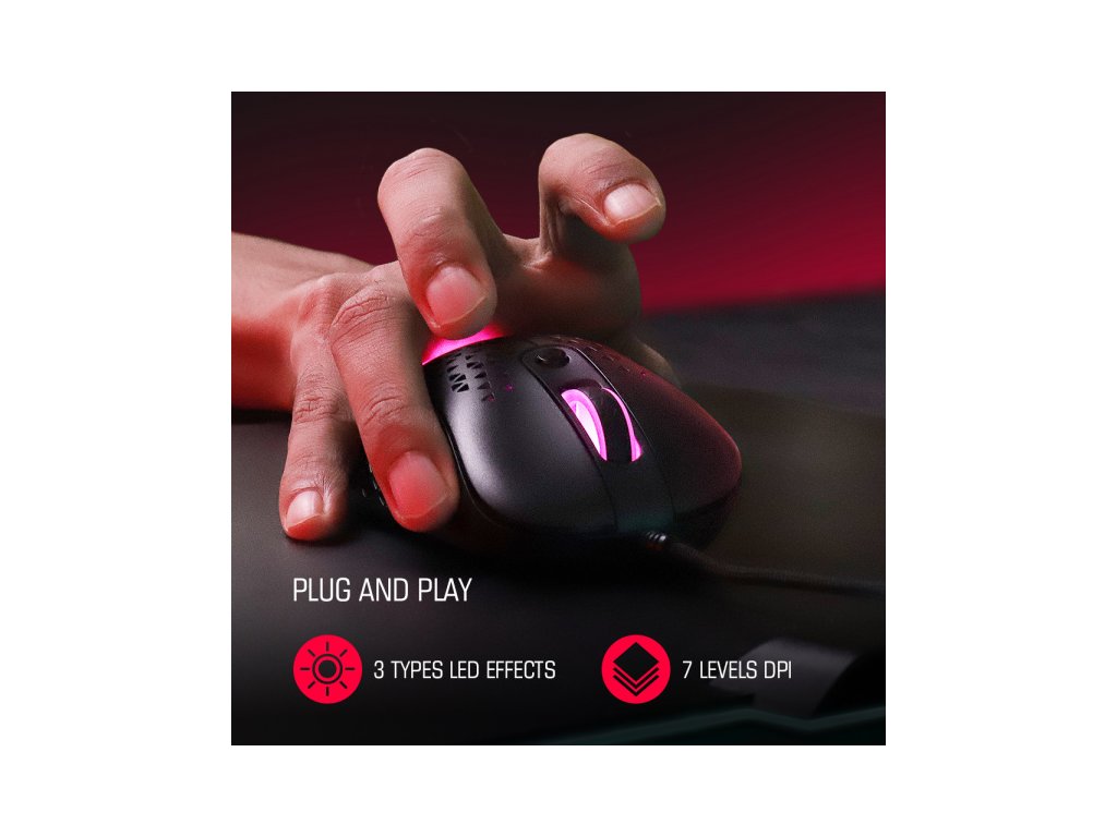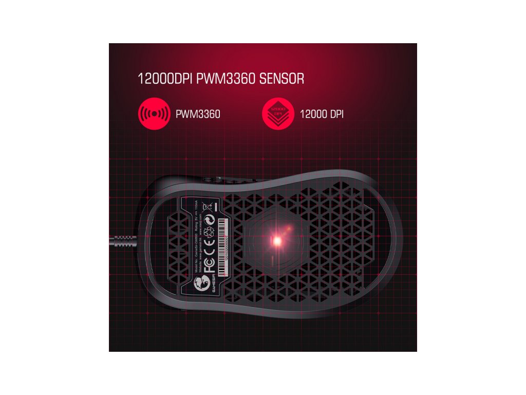 - Myš je vybavená optickým senzorom PMW3360 (max. 12 000 DPI), ktorý zaisťuje vysokú presnosť a rýchlosť.