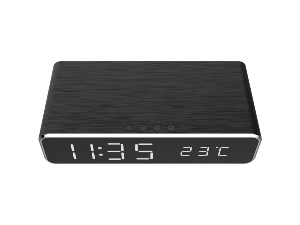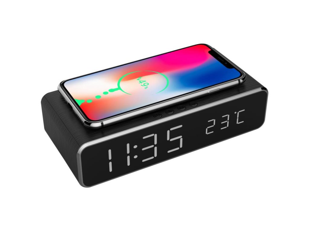 Digitálny budík s funkciou bezdrôtového nabíjania. Vstavaný modul bezdrôtového nabíjania (Qi) pre jednoduché nabíjanie vašich zariadení iPhone X/XS/XR, iPhone 8, Galaxy S8/S7/S6 a ďalších zariadení s funkciou bezdrôtového nabíjania. Veľký LCD displej zobrazuje čas, dátum a teplotu. Duálna funkcia alarmu umožňuje nastaviť 2 samostatné budíky. Vstupný výkon: 5V/1,5A. Bezdrôtový výstup: 5V/1A 5W (adaptér nie je v balení)Dodatočné parametre