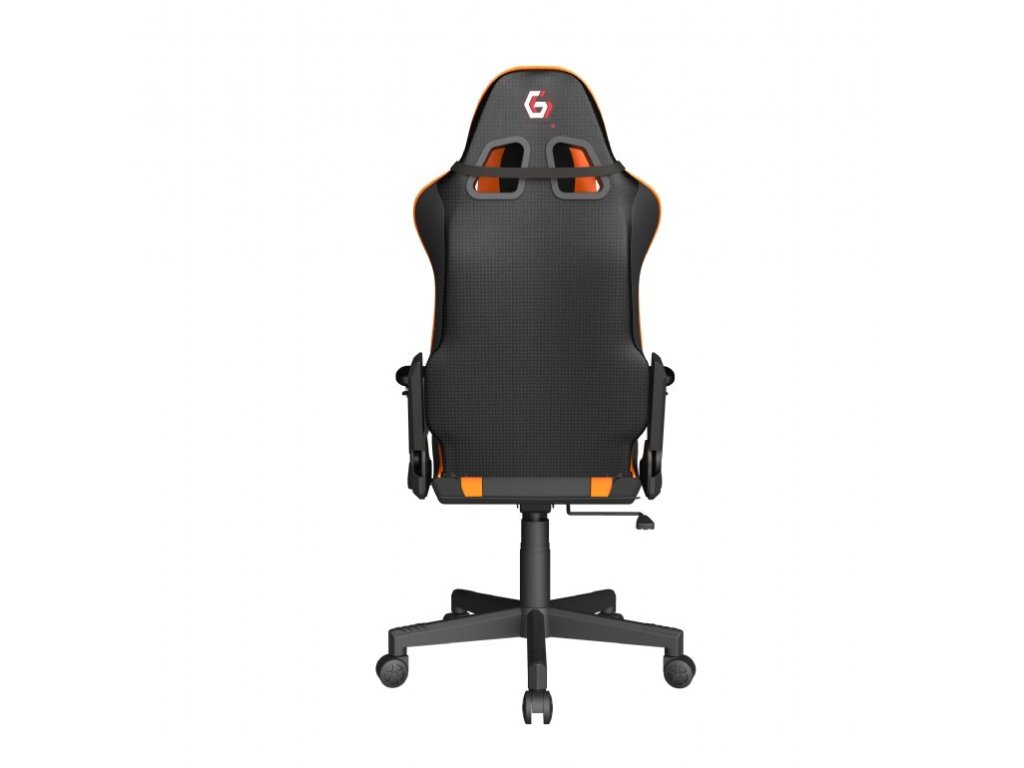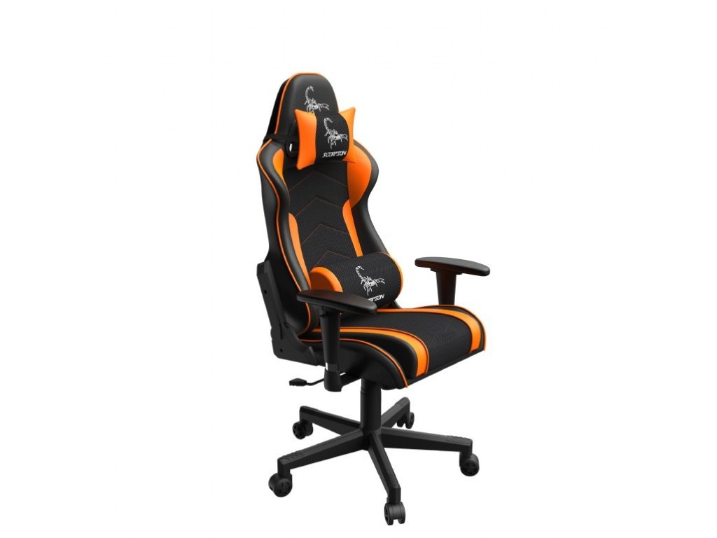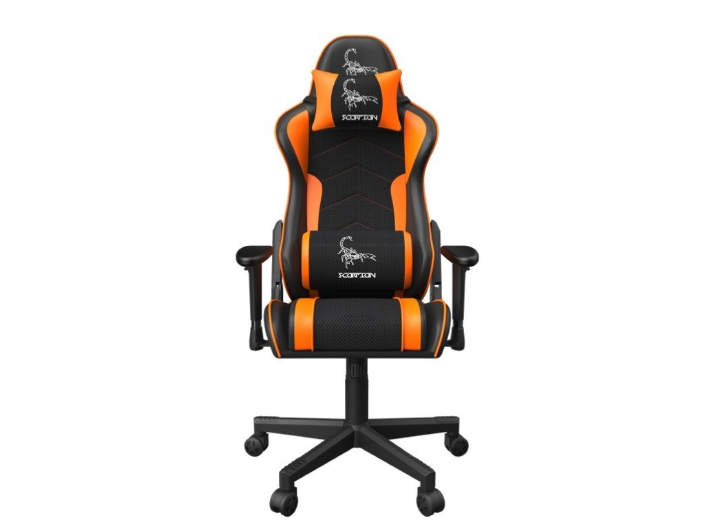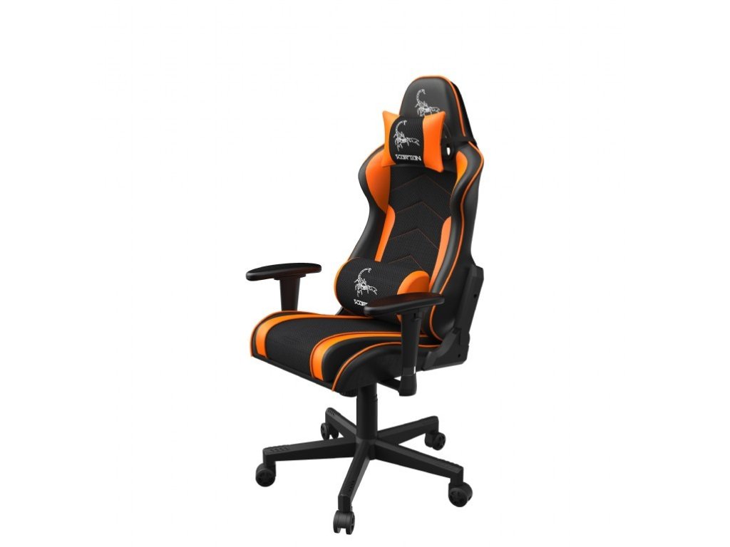 Gembird herní židle Scorpion - černá/oranžová Počítačová židle z PVC *Silná nylonová základna, houba v opěradle a krční opěrce a tvarovaná pěnauvnitř sedáku. *Odvětrávaný síťovaný sedák a přední část *2D nastavitelná područka *Naklápěcí mechanismus, plynový zdvih a PU kolečka