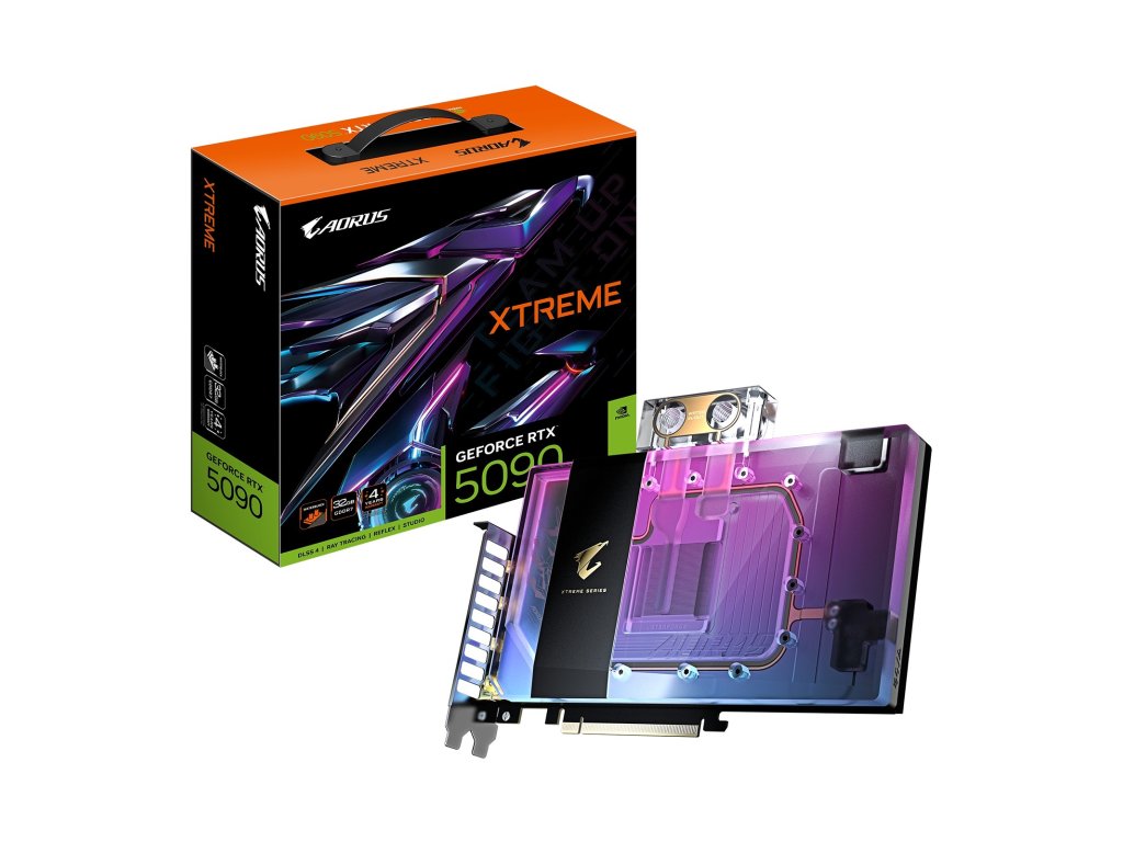 GIGABYTE AORUS GeForce RTX™ 5090 XTREME WATERFORCE WB 32G * architektura NVIDIA Blackwell a DLSS 4 * chladicí systém WATERFORCE Water Block * RGB podsvícení * patentovaná detekce netěsností * ochranná kovová zadní deska * záruka 4 roky (po online registraci)