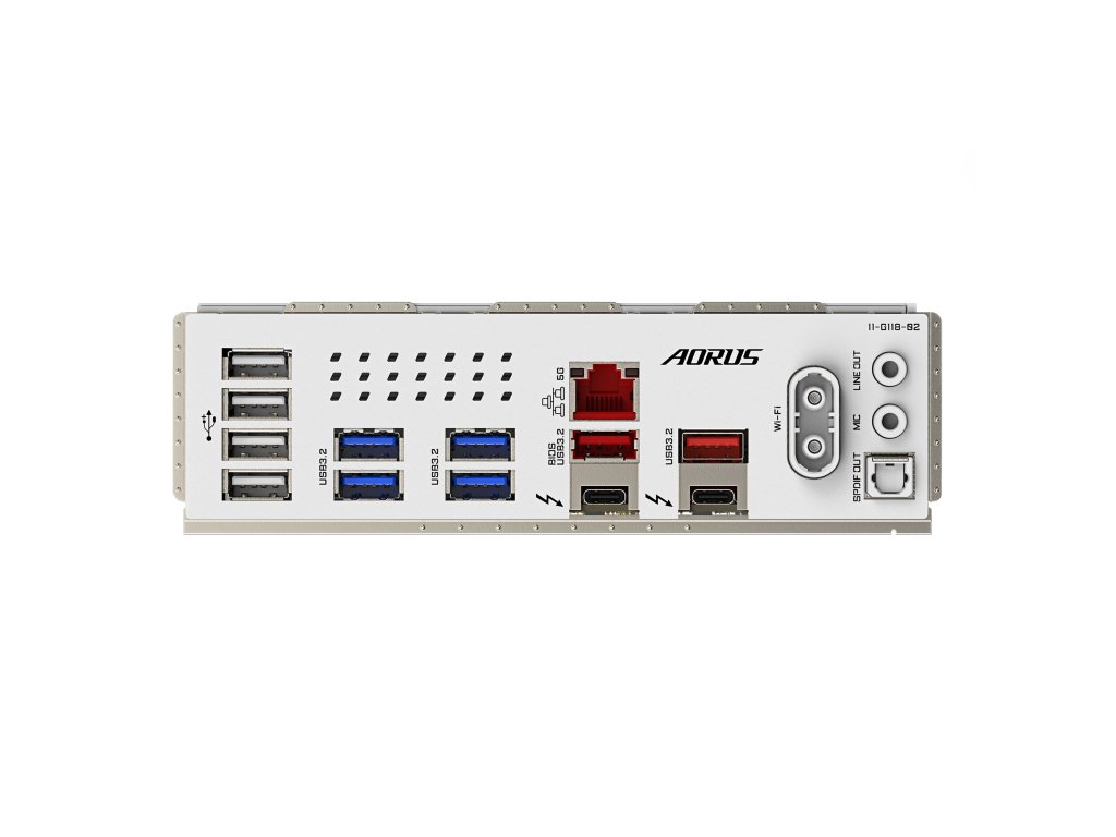 Porty na zadním panelu: * 2x Intel® Thunderbolt™ 4 (USB4® USB Type-C® porty) * 2x USB 3.2 Gen 2 typ-A (červené) * 4x USB 3.2 Gen 1 * 4x USB 2.0/1.1 * 2x anténní konektor (2T2R) * 1x RJ-45 * 1x optický konektor S/PDIF Out * 2x audio jack