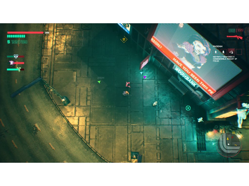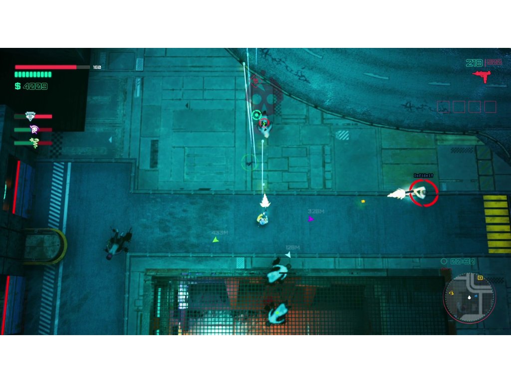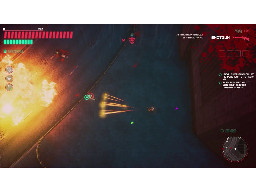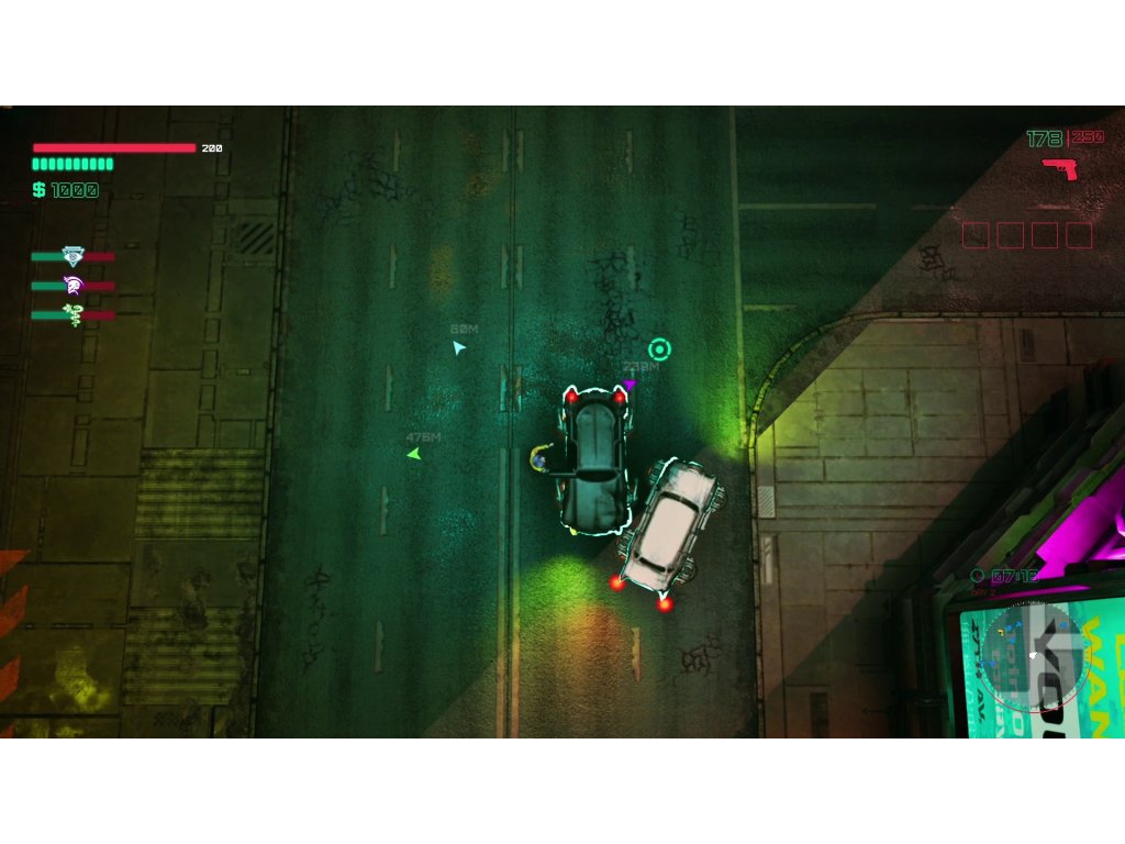 The gameplay of Glitchpunk is a feast for all fans of high-octane action, explosive shootouts and cyberpunk aesthetics. It is top-down action inspired by the classics of the genre, wrapped in a futuristic neon cloak. There’s plenty of guns, melee weapons and vehicles for you to choose from and cause havoc with. Experience frantic action and wild police chases while listening to futuristic beats on your stolen car’s radio.