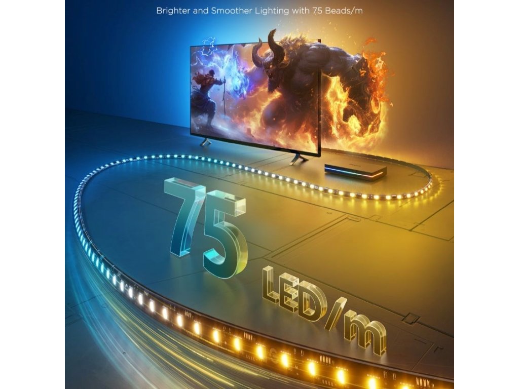 Govee AI Sync Box Kit 2 je vybavený RGBWIC svetelným pásikom s mimoriadnou hustotou 75 LED na meter, čo zabezpečuje maximálne plynulú a presnú reprodukciu farieb. Vďaka tejto vysokej hustote LED diád vytvára svetlo intenzívnu atmosféru, ktorá dokonale ladí s každou scénou na obrazovke.