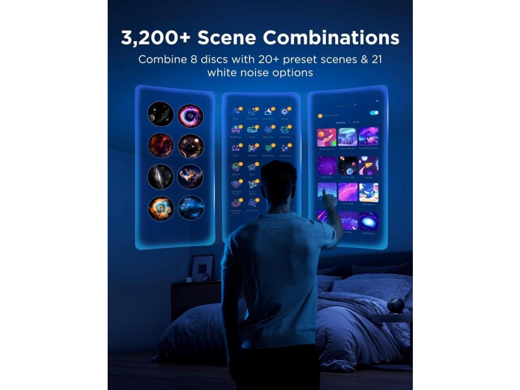 Vďaka ôsmim výmenným diskom, viac ako dvadsiatim vizuálnym scénam a jedenadvaceti zvukovým režimom ponúka projektor cez 3 200 kombinácií prostredí. Môžete si tak navoliť atmosféru presne podľa nálady – od pokojného spánku po kreatívne podkresy na zábavu. Variabilita z neho robí dokonalého spoločníka pre každý okamih.