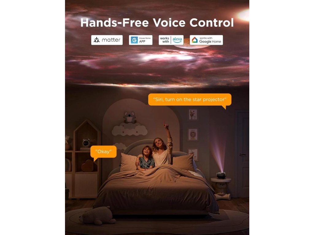 Vďaka pokročilým funkciám sa Govee Galaxy Light Projector 2 Pro ľahko stane súčasťou vášho chytrého domu. Podpora Matter, Alexa aj Google Assistant znamená plnú kompatibilitu a rýchle hlasové ovládanie. Pomocou aplikácie Govee Home môžete okamžite prepínať medzi obľúbenými scénami, nastaviť jas alebo zmeniť motív. To všetko bez zložitých nastavení, s možnosťou prispôsobiť si atmosféru na mieru jedným dotykom.