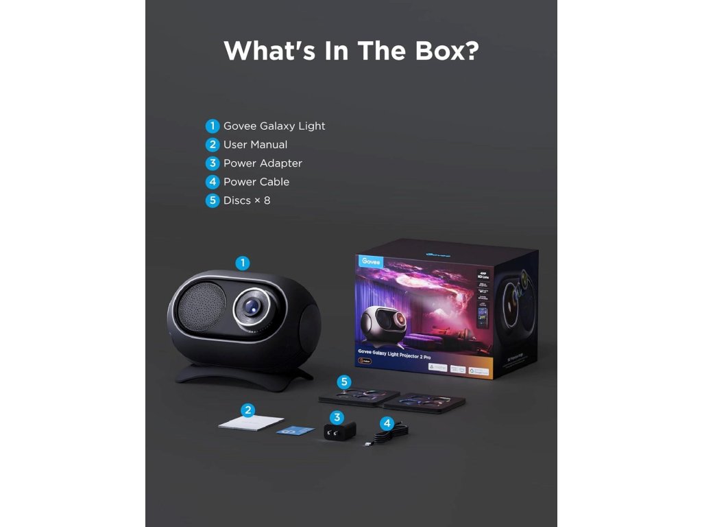 Súčasťou balenia je osem unikátnych diskov s rôznymi galaktickými motívmi, ktoré možno ľahko a rýchlo meniť. Každý disk prináša odlišnú atmosféru, od mliečnej dráhy až po realistickú nočnú oblohu. Vďaka jednoduchému mechanizmu výmeny môžete okamžite premeniť svoj priestor.