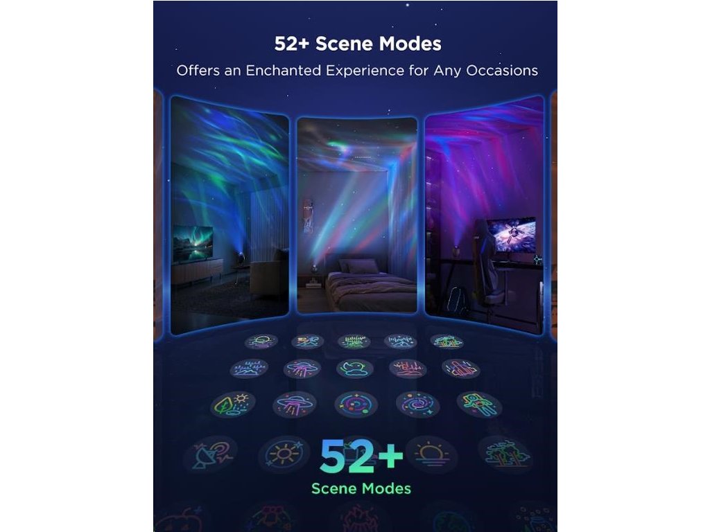 Govee Star Light Projector ponúka viac než 52 prednastavených scén a výkonný DIY režim, ktorý vám umožní nezávisle ovládať laserovú hviezdnu projekciu aj LED mlhovinu. Môžete kombinovať farby, efekty a intenzitu svetla podľa svojich predstáv, čím vytvoríte unikátne a personalizované svetelná šou. Či už túžite po pokojnej relaxačnej atmosfére alebo dynamickom vizuálnom zážitku, DIY režim vám poskytne plnú tvorivú kontrolu.