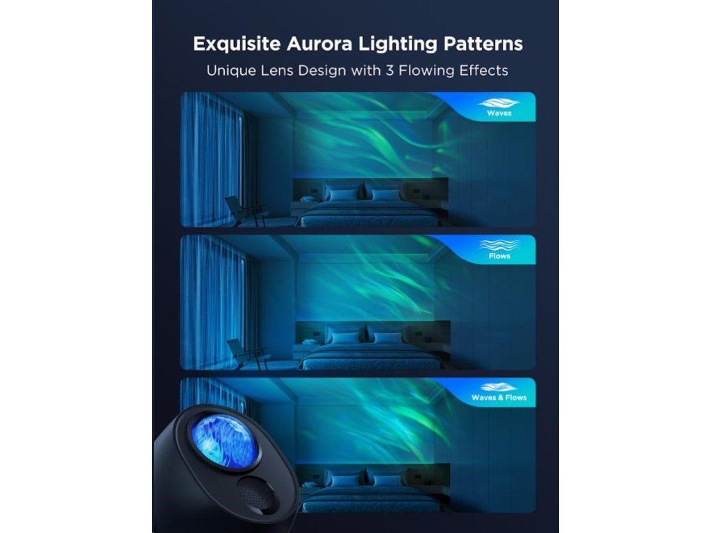 Govee Star Light Projector prináša pôsobivé mlhovinové vzory, ktoré môžu mať tvar vĺn, plynulých prúdov alebo ich kombinácie, čím vytvárajú dynamickú a fascinujúcu svetelnú šou. Vlnové vzory pridávajú jemný pohyb a pocit pokoja, zatiaľ čo prúdové efekty pridávajú energickejší a plynulejší dojem. Kombinácia oboch štýlov následne vytvára mimoriadne komplexnú a atraktívnu projekciu, ktorá prinesie do vášho priestoru harmóniu aj živost. Tieto variácie mlhoviny vám umožnia prispôsobiť osvetlenie presne podľa atmosféry, ktorú chcete vytvoriť.
