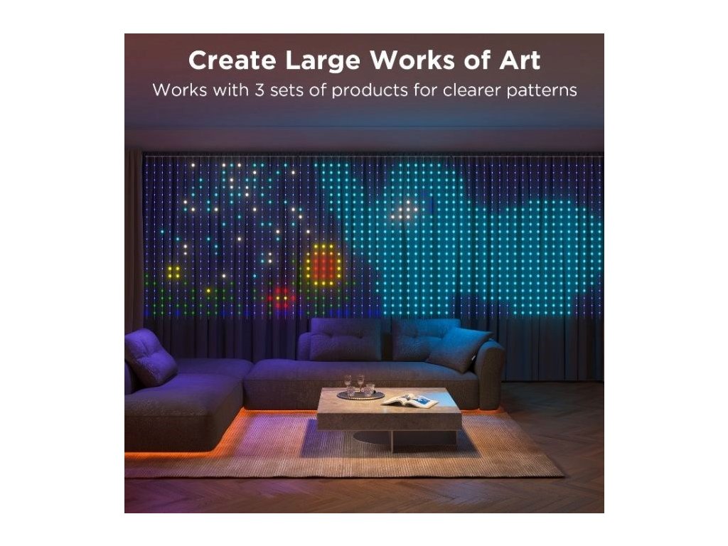 Svetelná opona Govee WIFI & Bluetooth vytvorí dokonalú svetelnú šou. Vďaka technológii RGBIC dokáže záves zostaviť obraz z 520 nezávisle fungujúcich LED diód. Popustite uzdu svojej fantázii a oživte svoje nápady na LED obrazovke v 16 miliónoch farieb. So svetelným závesom budete dokonale pripravení na každú príležitosť, ročné obdobie alebo dovolenku. Viac ako 84 prednastavených scén, 3 možnosti inštalácie a niekoľko automatických a manuálnych režimov dodajú vášmu priestoru jedinečný vzhľad. Príkazy môžete zadávať aj hlasom prostredníctvom Siri, Amazon Alexa alebo Google Assistant, a to prostredníctvom aplikácie Govee Home v smartfóne alebo tablete. Aby toho nebolo málo, môžete pripojiť až tri závesy a vytvoriť tak priestor s rozmermi 4,5 x 2 metre. To je slušná plocha na ľahké graffiti.