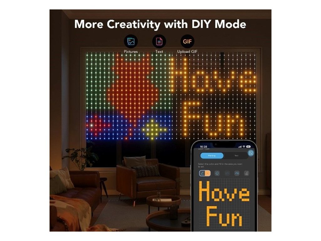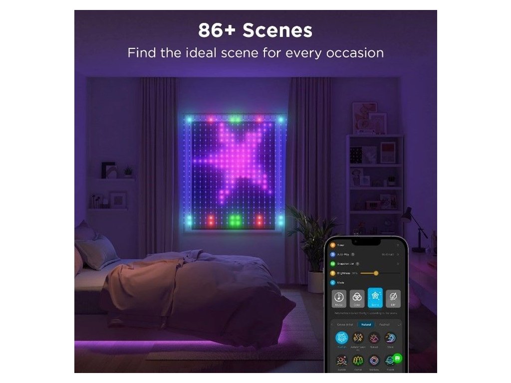 Myslíme na každú príležitosť, preto je v každej záclone predinštalovaných viac ako 80 scén a vzorov. Možno ste vášnivý hráč, milovník prírody alebo jednoducho milujete svetelné zážitky, Govee na vás myslí. Ak by vám to nestačilo, záves umožňuje prekresľovať nahrané fotografie a obsahuje zábavný editor GIF.