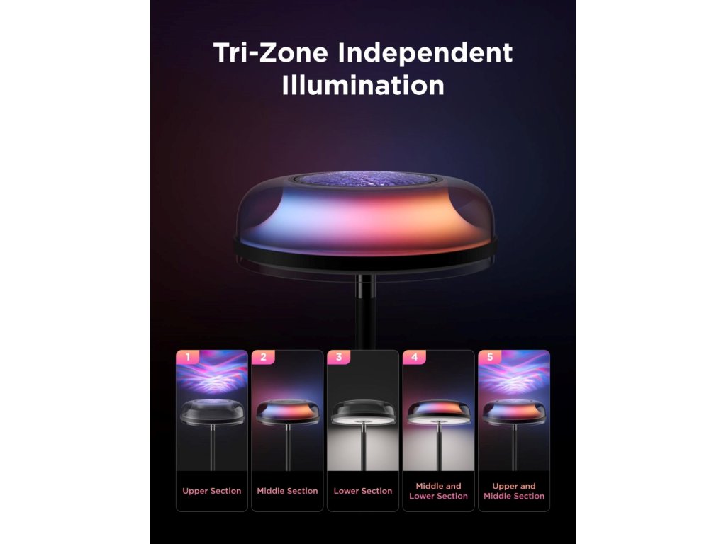 Trojité zónové osvetlenie umožňuje individuálne nastavovať spodnú, strednú a hornú časť lampy podľa vašich potrieb. Spodná LED poskytuje praktické každodenné svetlo, stredná zóna jemne osvetľuje priestor a horný projekčný efekt pridáva dramatický vizuálny zážitok. Vďaka tomuto systému môžete vždy vytvoriť dokonalú atmosféru pre každú príležitosť.
