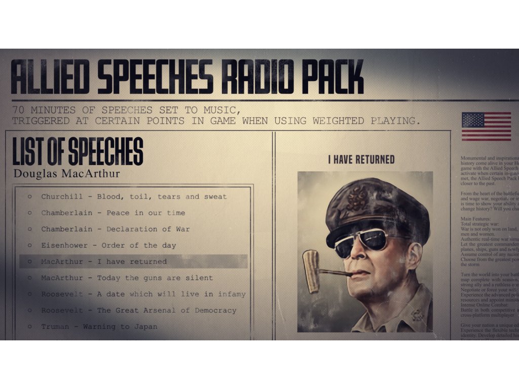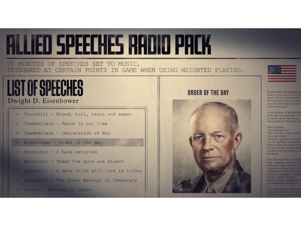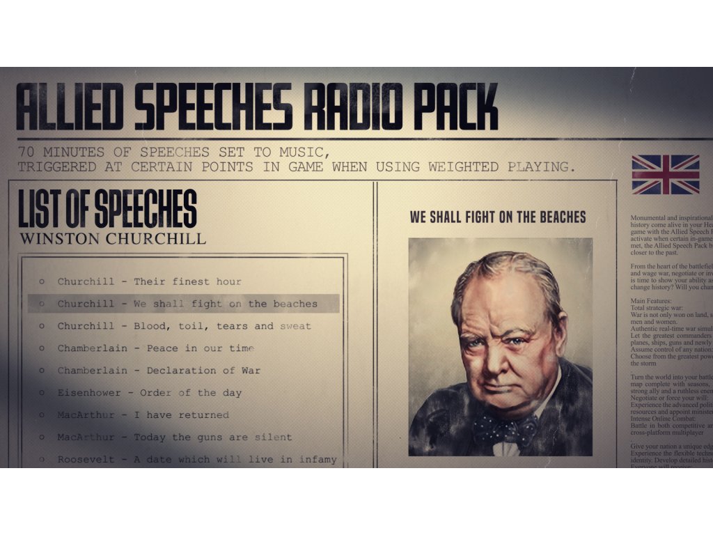 Monumental and inspirational moments from history come alive in your Hearts of Iron IV game with the Allied Speech Pack. Set to activate when certain in-game conditions are met, the Allied Speech Pack brings you closer to the past.