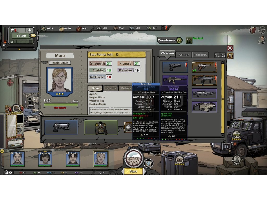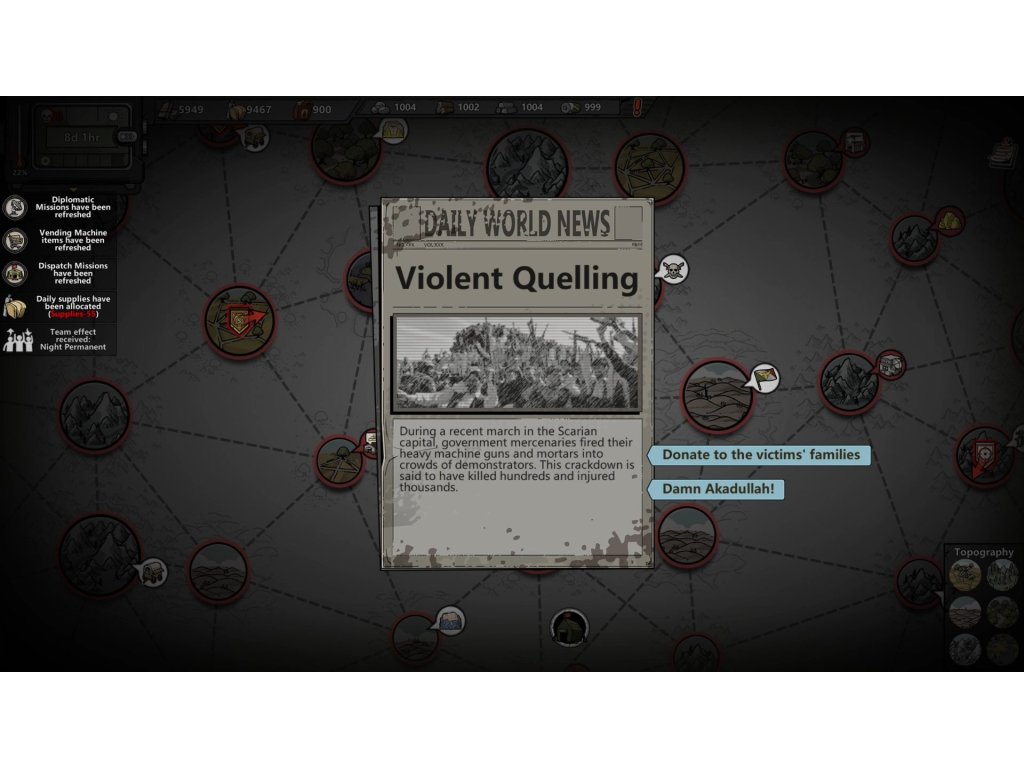 The adventure is inspired by Darkest Dungeon in which you follow the story of the game from side-scrolling perspective. Explore randomly generated locations, gather drops of deadly weapons and sturdy armour, and claim cities. Travel around the open world to find oil fields and other important resources that will help you survive and fight the brutal regime.
