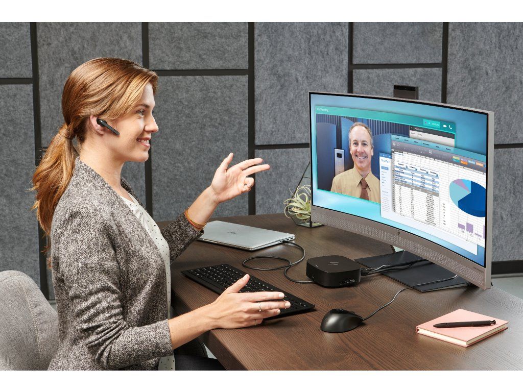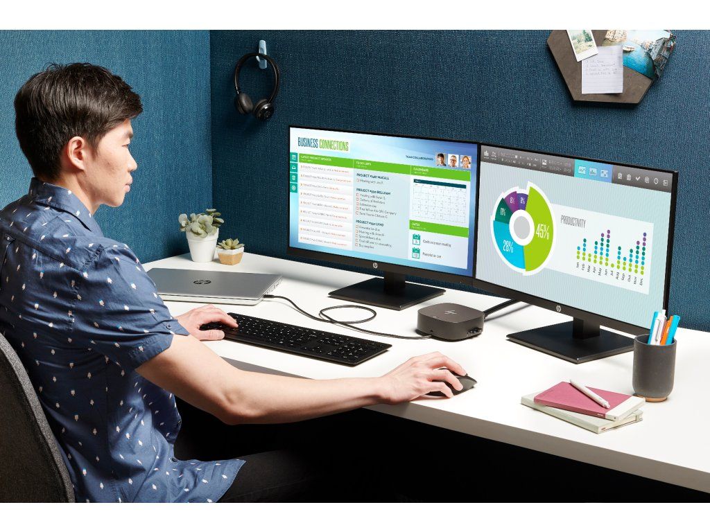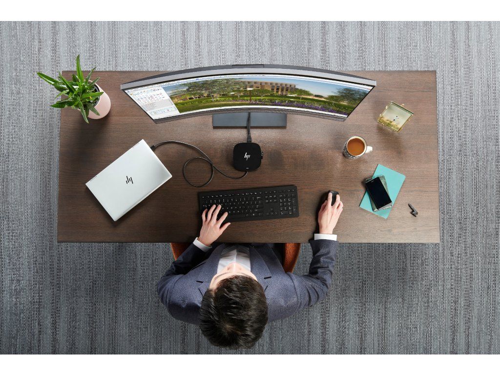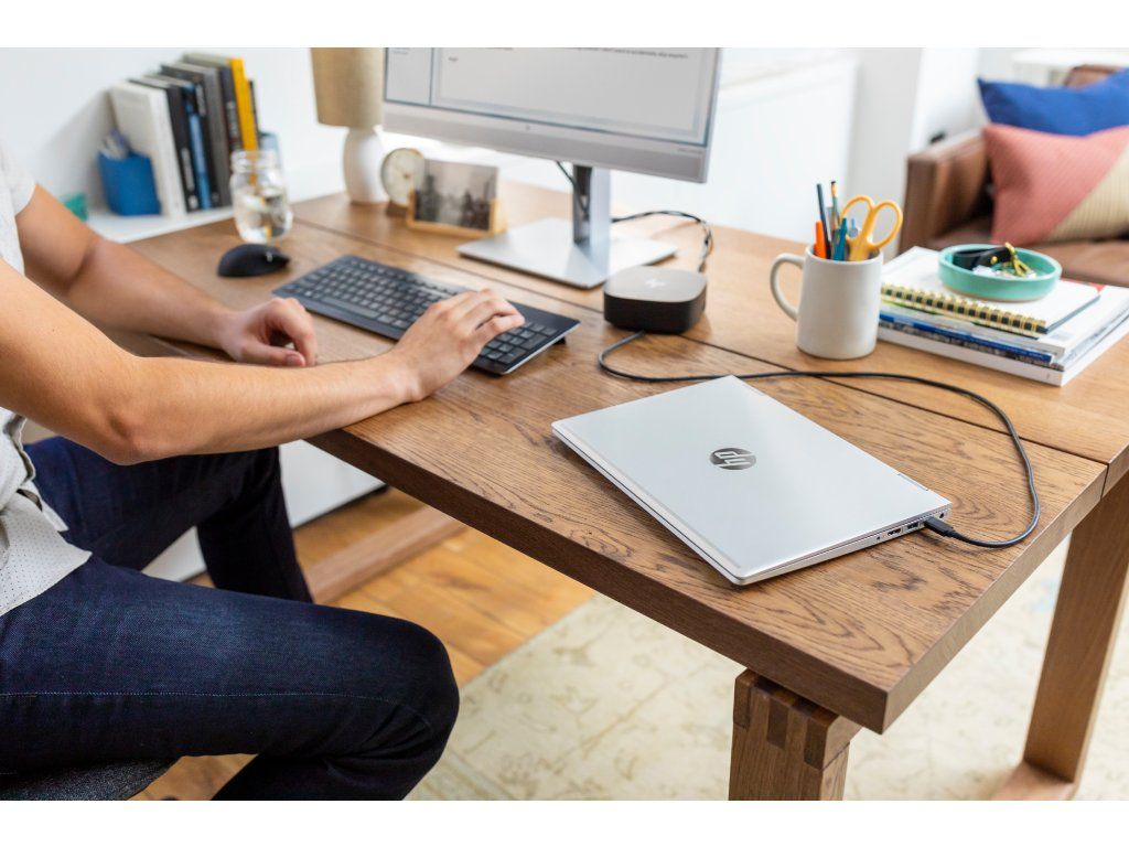 Pripojte kábel dokovacej stanice k portu USB-C a používajte káblovú siet, pripájajte sa k externým monitorom a k príslušenstvu prostredníctvom dvoch portov DisplayPort, HDMI, RJ-45 a piatich portov USB (4x USB 3.0, 1x USB-C).