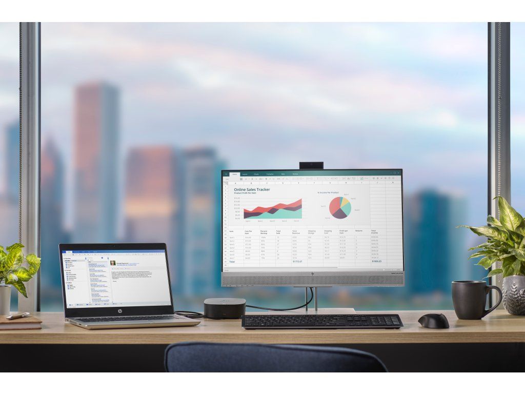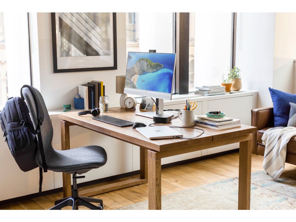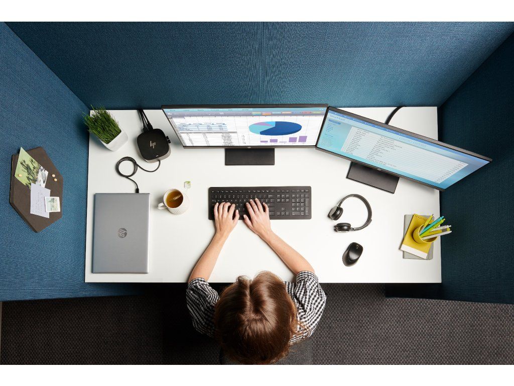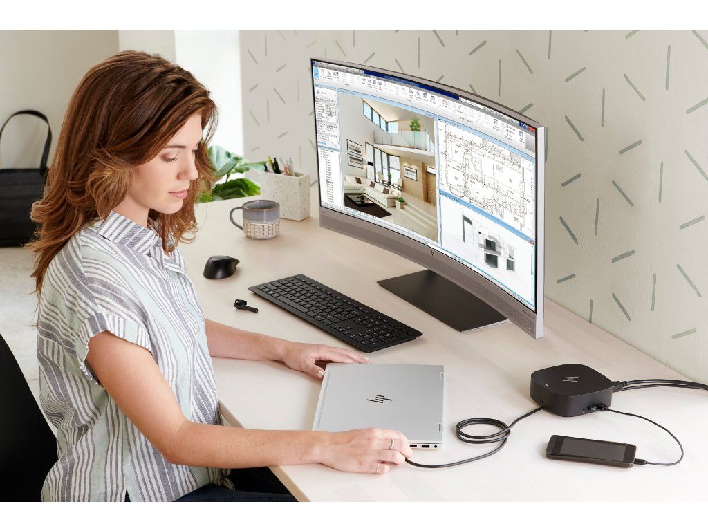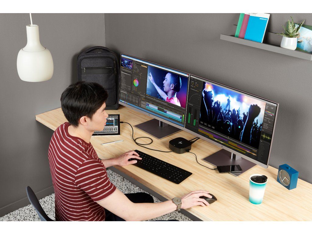 Pripojte kábel dokovacej stanice k portu USB-C a používajte káblovú siet, pripájajte sa k externým monitorom a k príslušenstvu prostredníctvom dvoch portov DisplayPort, HDMI, RJ-45 a piatich portov USB (4x USB 3.0, 1x USB-C).