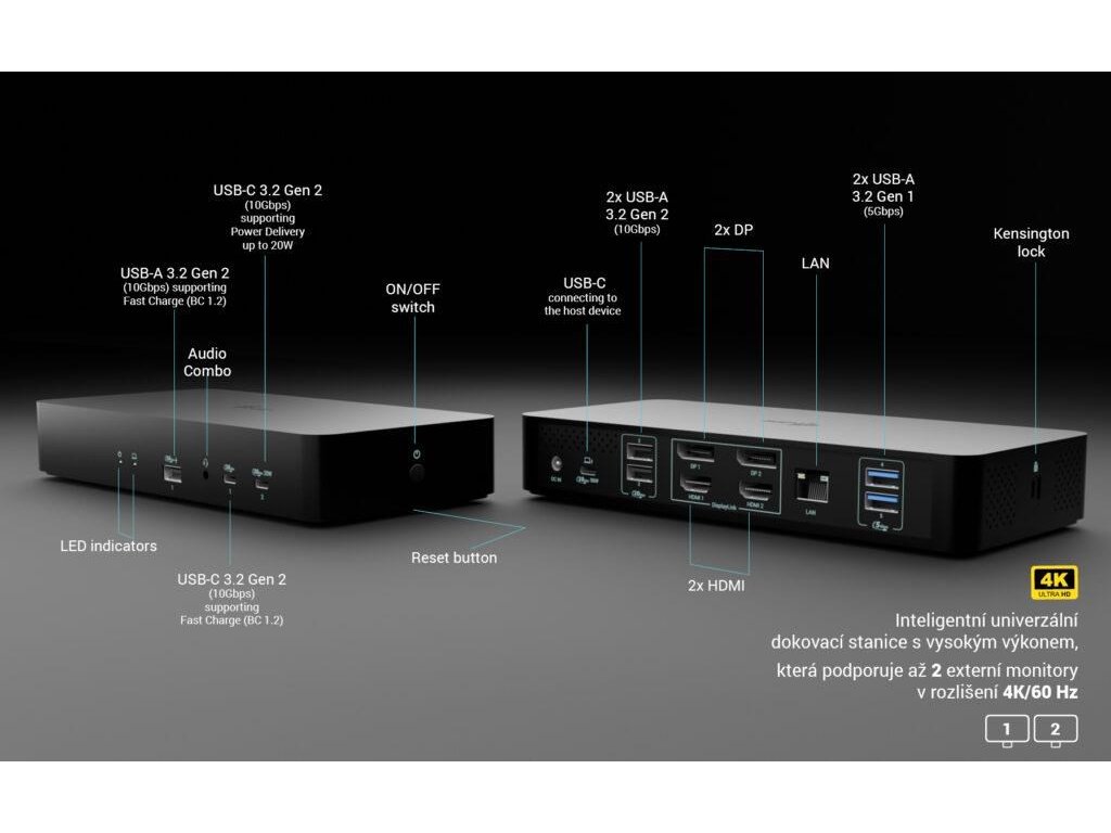 Táto výkonná kancelárska dokovacia stanica podporuje superrýchle USB Gen 2 porty s funkciou rýchleho nabíjania. Umožňuje výstup až na dva externé monitory s vysokým rozlíšením až 4K. Dá sa použiť s takmer akýmkoľvek notebookom, pretože podporuje všetky bežné typy pripojenia: USB-A, USB-C, USB4 a Thunderbolt 3/4/5, a zároveň je kompatibilná so všetkými modernými operačnými systémami.