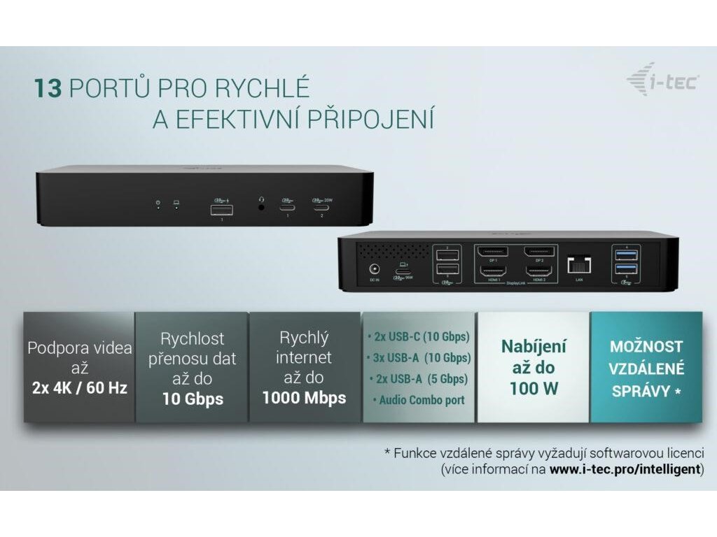 - Táto výkonná a univerzálna dokovacia stanica je vybavená dedikovaným LAN portom, ktorý umožňuje plnú vzdialenú správu – až na úroveň jednotlivých portov – odkiaľkoľvek. Správa funguje aj bez pripojenia k hostiteľskému zariadeniu – stačí napájanie a pripojenie do LAN.