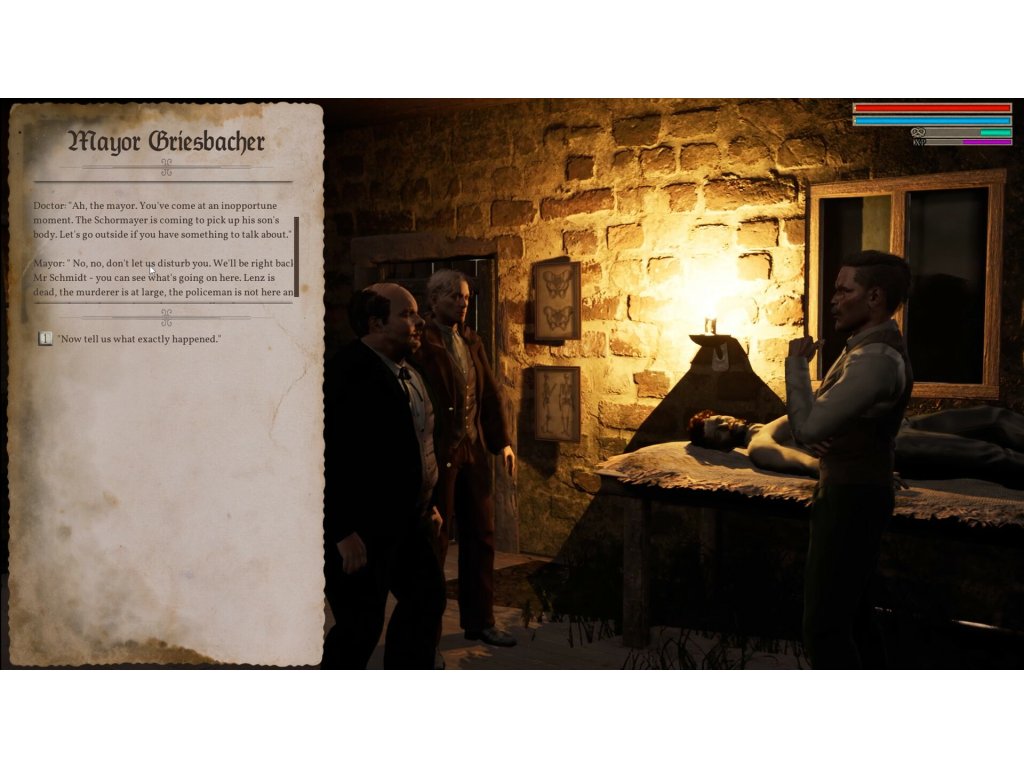 In a third-person RPG detective story, set in Bavaria in 1866, the medical student Valentin Schmidt travels to Wolpertshofen, when a sudden death causes turmoil in the village. Use your skills, find clues and question the villagers to stop the murders.
