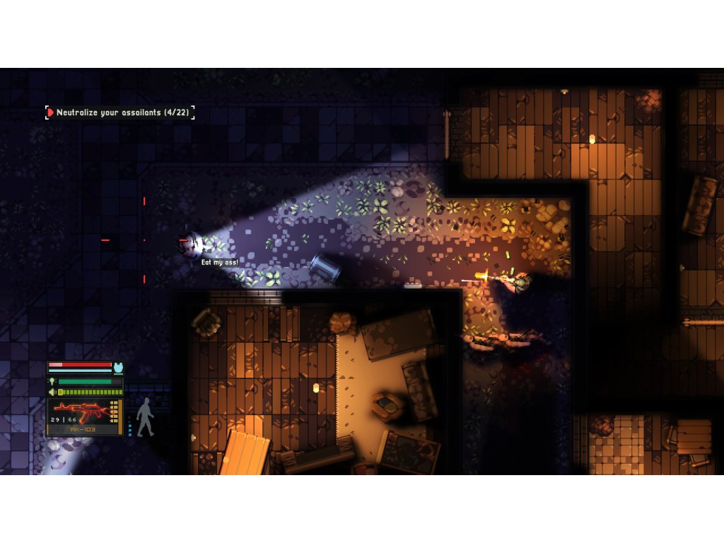 - Choose your loadout. Pick a rifle, a pistol, and a bulletproof vest to be ready for combat, or just a pistol and naught else, to be quick, agile, and silent- ready for improvisation.