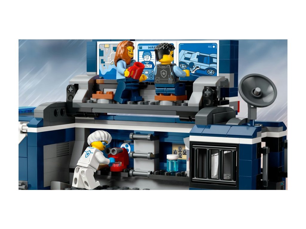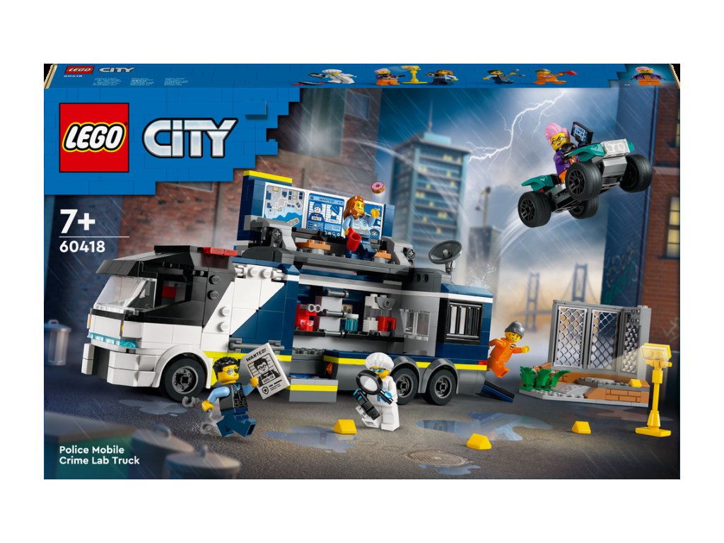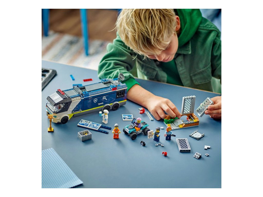 Zločinci nemajú v LEGO® City šancu. Sú na stope policajtom, ktorí prehľadajú miesto činu a potom všetko preskúmajú v mobilnom kriminalistickom laboratóriu, ktoré obsahuje pracovné stanice, monitory, mikroskop a väzenskú celu. Súčasťou stavebnice je aj plagát "Policajné pátranie" s QR kódom. Po jeho naskenovaní si môžeš vychutnať zábavné video dobrodružstvo z LEGO® City. Súpravu možno samozrejme kombinovať s ďalšími budovami alebo vozidlami.Súpravy zo série LEGO® City sú inšpirované životom v meste a ponúkajú realistické repliky a stroje spolu so zábavnými postavičkami, ktoré inšpirujú k nápaditej hre. Deti môžu skúmať svoje obľúbené pozemné, vzdušné a námorné vozidlá a pri stavaní a hraní si rozvíjať fyzické zručnosti a sebavedomie.