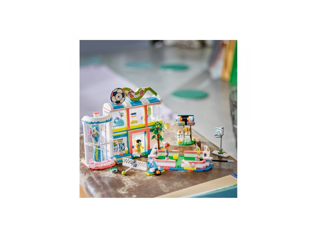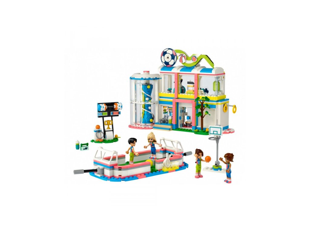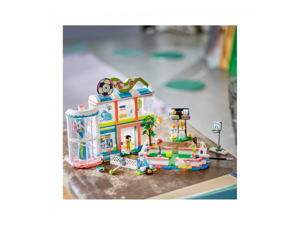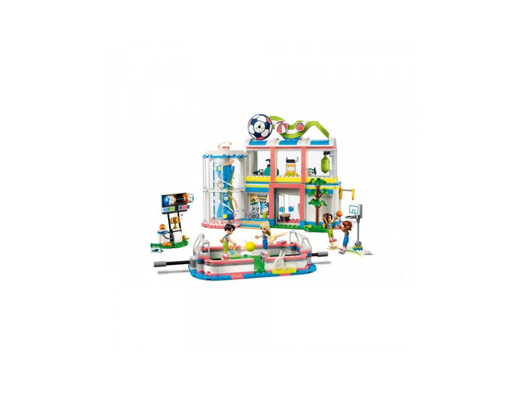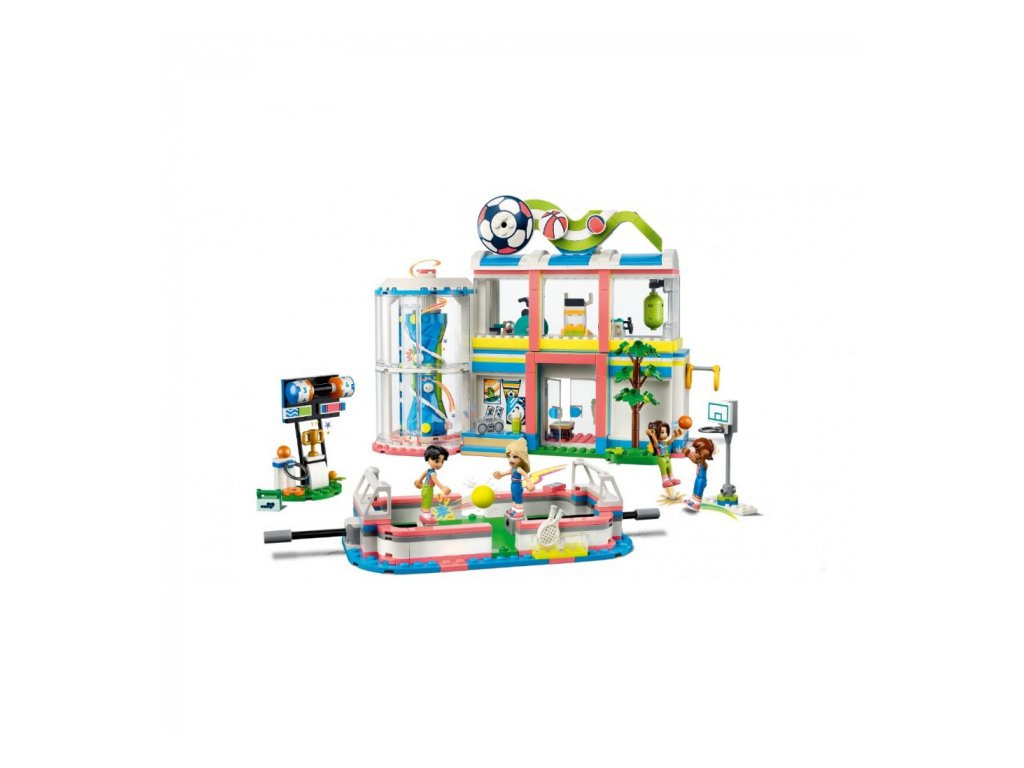 Športové centrum je dobre vybavené. Ihrisko sa dá prispôsobiť rôznym športom jednoduchou výmenou brán a sietí. Zahrajte si futbal s ostatnými. Keď vás to omrzí, môžete ihrisko jednoduchou výmenou brán a sietí premeniť na basketbalové alebo tenisové ihrisko. Samozrejmosťou je výsledková tabuľa a miesto na odkladanie loptičiek.Súpravy LEGO® Friends sú dokonalé hračky pre deti, v ktorých podporujú objavovanie a záujmy s pomocou 5 dievčat z mestečka Heartlake.