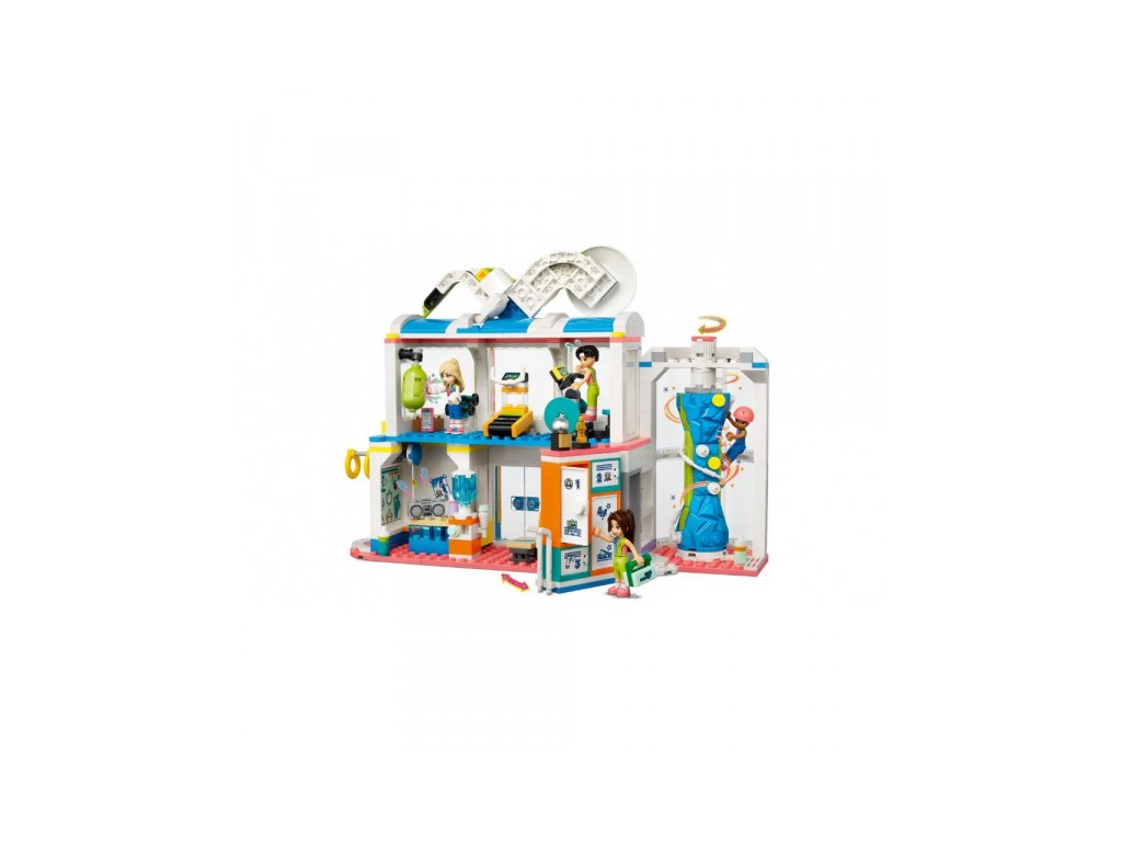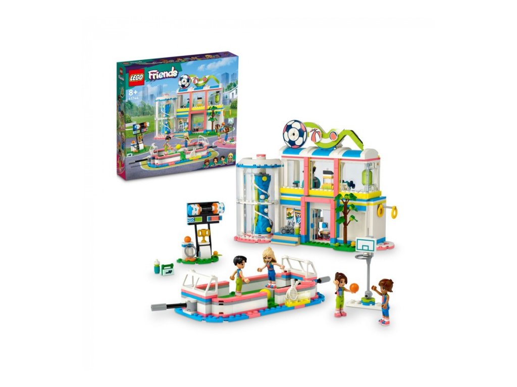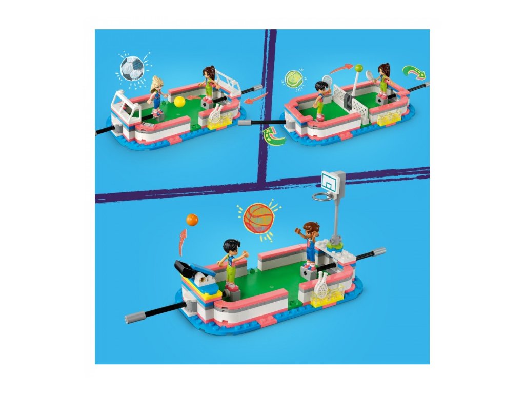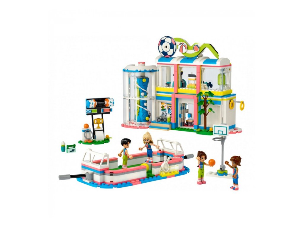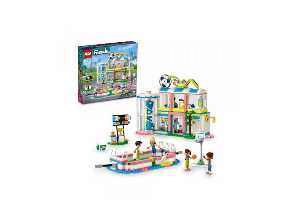 Športové centrum je dobre vybavené. Ihrisko sa dá prispôsobiť rôznym športom jednoduchou výmenou brán a sietí. Zahrajte si futbal s ostatnými. Keď vás to omrzí, môžete ihrisko jednoduchou výmenou brán a sietí premeniť na basketbalové alebo tenisové ihrisko. Samozrejmosťou je výsledková tabuľa a miesto na odkladanie loptičiek.Súpravy LEGO® Friends sú dokonalé hračky pre deti, v ktorých podporujú objavovanie a záujmy s pomocou 5 dievčat z mestečka Heartlake.