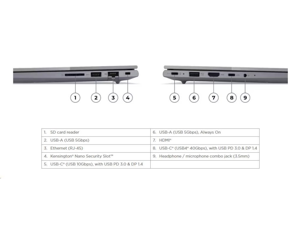 | Standartné porty | 1x USB-A (USB 5Gbps / USB 3.2 Gen 1) 1x USB-A (USB 5Gbps / USB 3.2 Gen 1), Always On 1x USB-C (USB 10Gbps / USB 3.2 Gen 2), with USB PD 3.0 and DisplayPort™ 1.4 1x USB-C (USB4 40Gbps), with USB PD 3.0 and DisplayPort™ 1.4 1x HDMI 2.1, up to 4K/60Hz 1x Headphone / microphone combo jack (3.5mm) 1x Ethernet (RJ-45) 1x SD card reader |