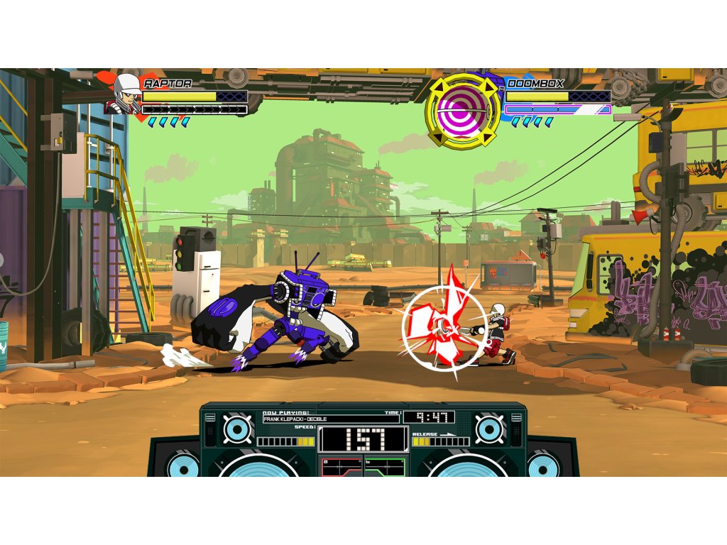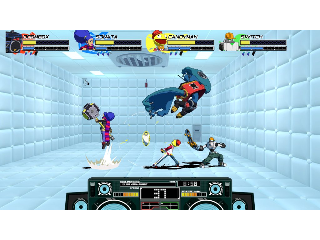After making your choice, the actual match begins. The goal of this fighting game is to strike the ball so skillfully and hard that it hits the face of your opponent. Too simple? There is more. The ball speeds up after each hit, and the game becomes hotter and even more twisted. The player must not only show some dexterity and reflexes but also use the unique skills of his hero to his advantage. And all this to the accompaniment of epic funk music and in the big city scenery set in the cartoonish style well known from the 90s.
