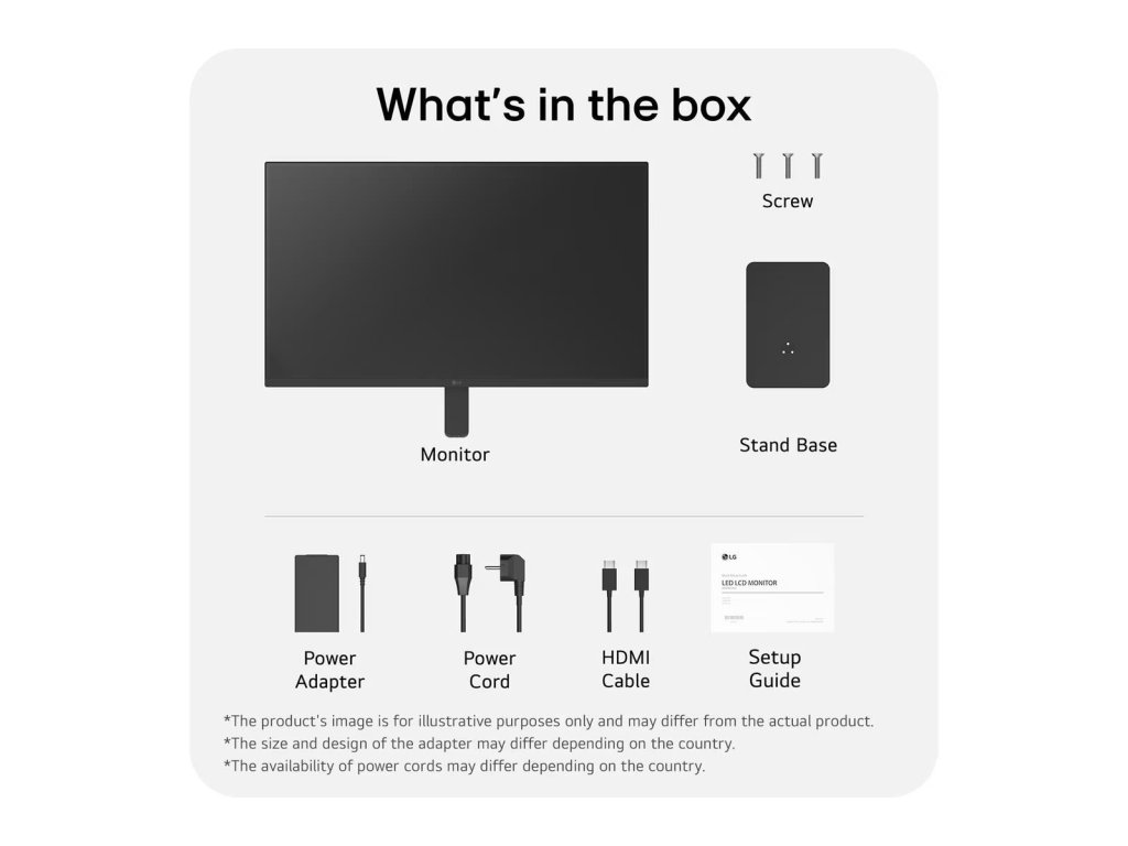 - Základňa stojanu 2. Skrutky 3. Napájací adaptér 4. Napájací kábel 5. Kábel HDMI 6. Návod na nastavenie