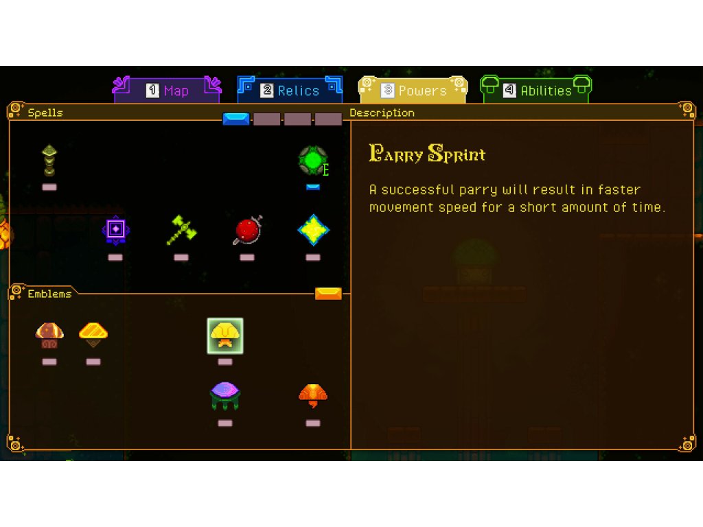 In addition to Emblems, there are Relics that work very similarly to the Charm system in Hollow Knight. Some change how your healing works and others increase your sword damage or give you additional protection. There are 60 Relics in the game and you choose what your strengths will be through the Relics. You can make some really specialized builds focusing on defense, healing, speed, melee attacking, or spell-casting!And then there are permanent upgrades that you gain from fighting bosses, these are all from spells to new moves and types of attacks!