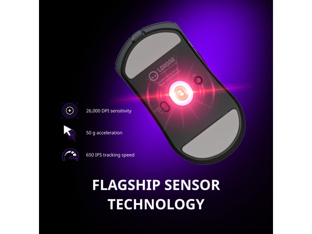Model MSE90W je vybavený vlajkovým snímačom Pixart 3395 a vykazuje výnimočnú presnosť s citlivosťou až 26 000 DPI a zrýchlením 50 g. Tento pokročilý optický snímač poskytuje spoľahlivé sledovanie až do 650 IPS, čím zabezpečuje presnosť na úrovni pixelov na akomkoľvek hernom povrchu.