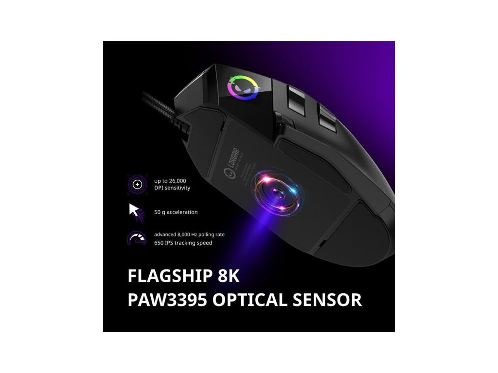 Lorgar MSP80, profi herná myš, 8 progr. tlač., senzor Pixart PAW3395, 26.000 DPI, režim podsv. RGB, biela