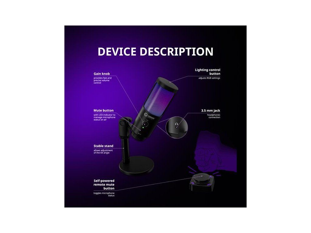 Lorgar SMP40, Profesionálny mikrofón s RGB osvetlením, hliníkovou konštrukciou, dotykovým stlmením a diaľkovým ovládaním