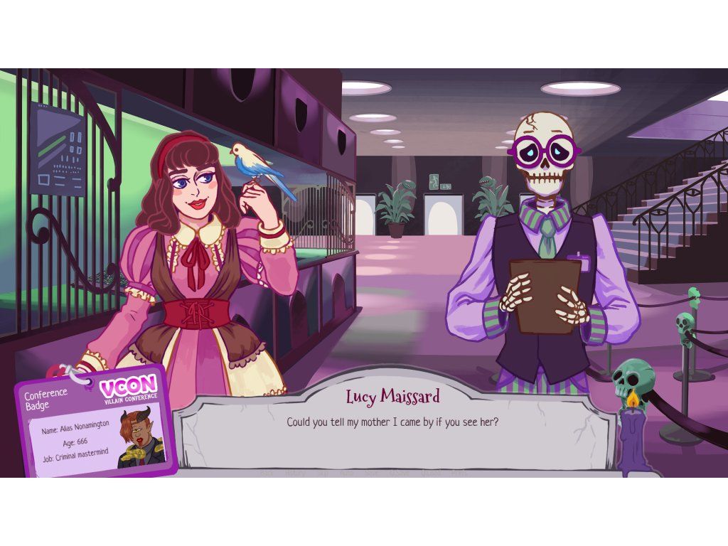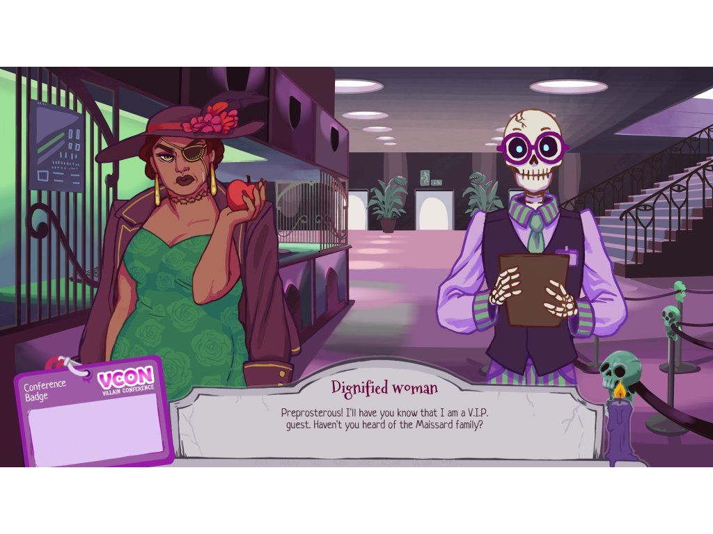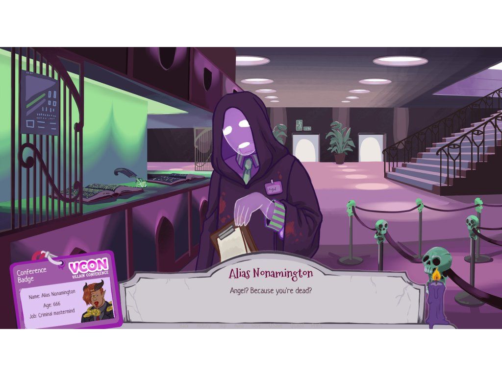 Welcome to the Villain Conference, your number one opportunity to make connections with other villains, whether you're a necromancer, a criminal mastermind or an evil demi-god! V-con is your chance to network with baddies from countless dimensions and universes, update your villainous expertise at various interesting talks, and learn the latest industry news. You're sure to have a wicked time!