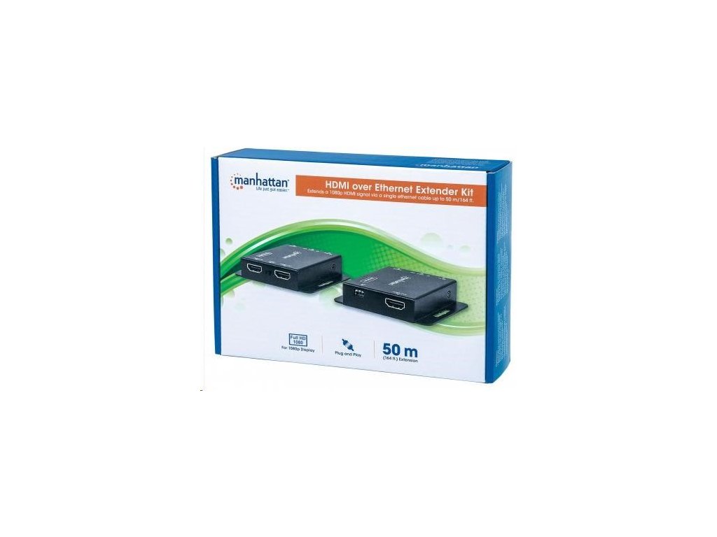 Súprava Manhattan 1080p HDMI over Ethernet Extender Kit je ideálnym riešením na pripojenie prakticky akéhokoľvek zdroja HDMI (PlayStation, Xbox, Blu-ray prehrávač, satelitný prijímač, digitálny rekordér atď.) k HD displeju alebo projektoru až do vzdialenosti 50 m (164 ft.) od zdroja prostredníctvom jedného ethernetového kábla Cat6. Tieto napájané extendery HDMI poskytujú spoľahlivý prenos videa s rozlíšením 1080p a viackanálového zvuku na väčšie vzdialenosti, ako je to možné len pomocou káblov HDMI. Modul vysielača má navyše ďalší výstupný port HDMI, ktorý umožňuje umiestnenie druhého monitora v riadiacej skrini alebo pripojenie druhého displeja. Na dodatočnú kontrolu kvality obsahuje súprava Manhattan 1080p HDMI over Ethernet Extender Kit prepínač EDID na minimalizáciu problémov so zobrazením, zabudovaný prepínač ekvalizéra na korekciu dlhodobého blikania obrazovky a širokopásmový IR blaster a prijímač na diaľkové ovládanie zdrojového zariadenia.