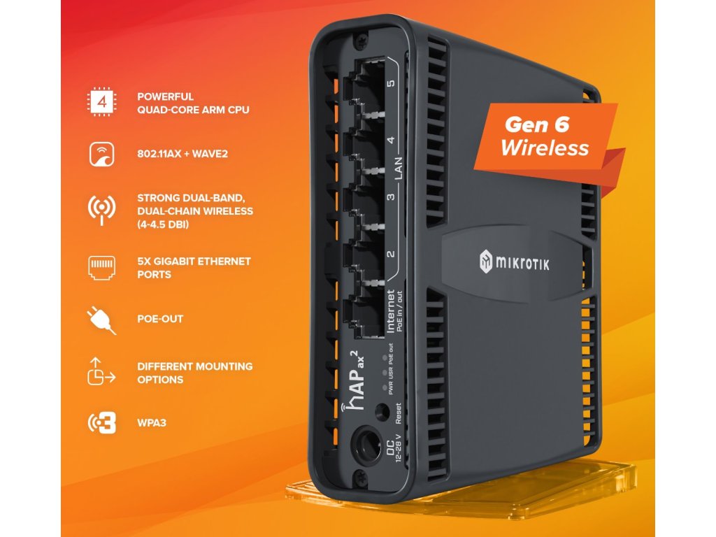 Wireless rozhraní hAP ax2 je nejmodernější dual-chain rádio 4-4,5 dBi standardu 802.11ax s podporou Wave2. V porovnání s předchozí generací skýtá až o 40 % vyšší rychlost v pásmu 5 GHz a až o 90 % vyšší rychlost ve spektru 2,4 GHz! Wi-Fi 6 standard 802.11ax a je zpětně kompatibilní se staršími bezdrátovými standardy. 802.11ac klientská zařízení budou využívat řadu dalších funkcí standardu 802.11ac Wave 2, jako je MU-MIMO či beamforming.