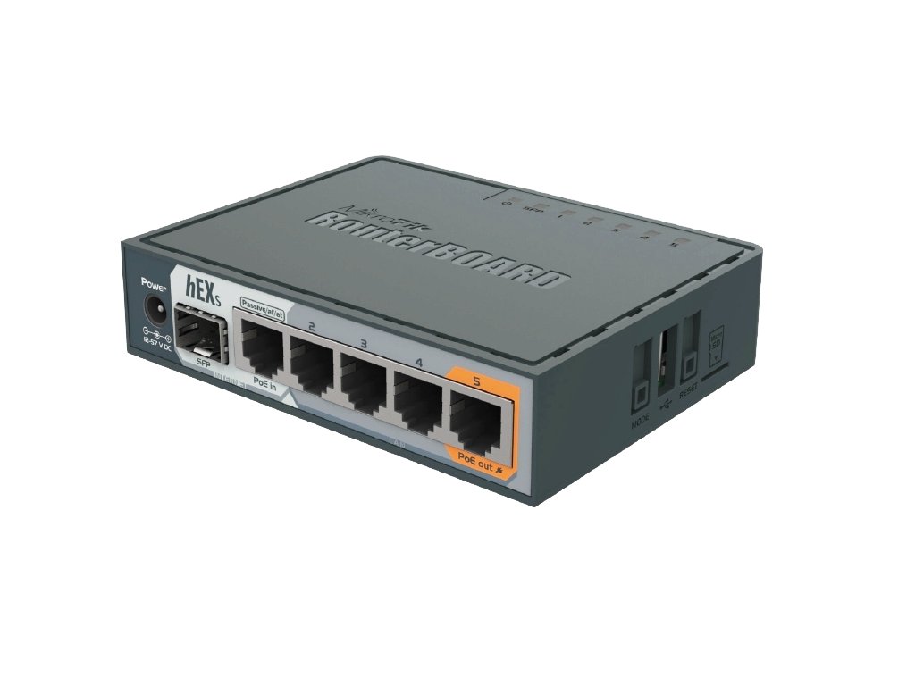 Systémové řešení platforem firmy MikroTik pro poskytovatele bezdrátového připojení k síti Internet. RouterBOARD hEX S je malý 5-ti portový Gigabitový ethernet router s jedním 1.25Gbit/s SFP portem dodávaný jako komplet v indoor SOHO provedení. Poháněn je 880MHz dvoujádrovým procesorem MT7621A, osazen 256 MB RAM, portem USB type A, slotem pro microSD kartu. PoE output (pasivní PoE) na Ethernet portu #5. PoE input (802.3af/at, pasivní PoE) na Ethernet portu #1. Zařízení podporuje IPsec hardwarovou encrypci (~470 Mbps). Součástí předinstalovaná ROS L4. Technické specifikace: Product code: RB760iGS CPU: MT7621A CPU nominal frequency: 880 MHz CPU core count: 2 CPU threads: 4 Size of RAM: 256 MB 10/100/1000 Ethernet ports: 5 SFP cages: 1 PoE in: Passive, 802.3af/at PoE out: Passive PoE up to 57 V (Ether5) Supported input voltage DC and PoE in: 12 - 57 V Max out per port output (input < 30 V): 500 mA Max out per port output (input > 30 V): 500 mA Max total out: 500 mA PCB temperature monitor: Yes Voltage monitor: Yes USB slot: type A MicroSD slot: 1 Operating temperature: -40°C to +70°C Dimensions: 113 x 89 x 28 mm License level: 4 Operating System: RouterOS Max Power consumption: 11 W Upozornění Výrobce Mikrotik neposkytuje záruku na zařízení poškozená přepětím. Zařízení je třeba adekvátně chránit proti indukovanému elektrostatickému přepětí či přepěťovým špičkám na silovém vedení.Dodatočné parametre