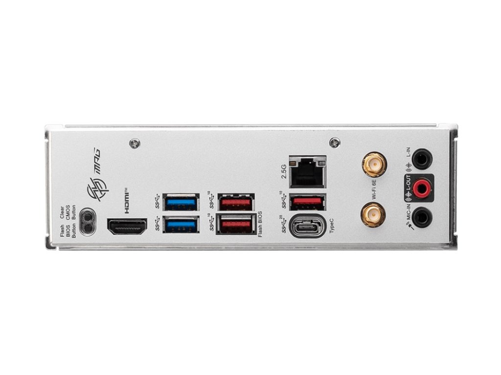 Porty na zadním panelu: * 1x tlačítko Clear CMOS * 1x tlačítko Flash BIOS * 1x RJ-45 2,5G LAN * 3x audio konektor * 1x HDMI™ * 1x USB 3.2 Gen 2x2 20Gb/s (typ C) * 3x USB 3.2 Gen 2 10Gb/s (typ A) * 2x USB 3.2 Gen 1 5Gb/s (typ A) * 1x Wi-Fi/Bluetooth