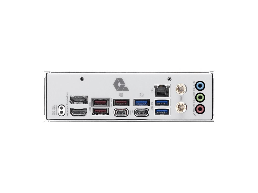 Porty na zadním panelu: * 2x USB 3.2 Gen 2 10Gb/s (typ C) * 3x USB 3.2 Gen 2 10Gb/s (typ A) * 3x USB 3.2 Gen 1 5Gb/s (typ A) * 1x HDMI™ * 1x DisplayPort 1.4 * 1x RJ-45 5G LAN * 1x Wi-Fi/Bluetooth * 3x audio konektor * tlačítko Flash BIOS * tlačítko Clear CMOS