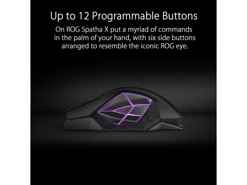 - Až 12 programovateľných tlačidiel - 12 programovateľných tlačidiel na ROG Spatha X vám umožní vykonávať nespočetné množstvo príkazov na dlani, pričom šesť bočných tlačidiel je usporiadaných tak, aby pripomínali ikonické oko ROG. Umiestnenie jednotlivých tlačidiel bolo starostlivo zvážené, aby boli na dosah, a všetky boli navrhnuté tak, aby poskytovali hmatový pocit kliknutia pre intuitívne a citlivé ovládanie.