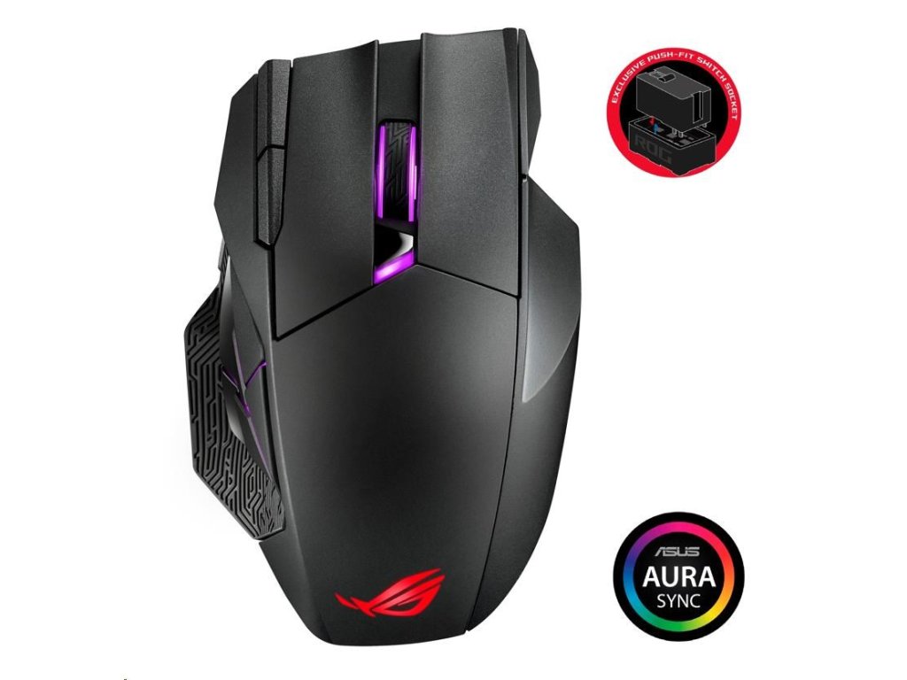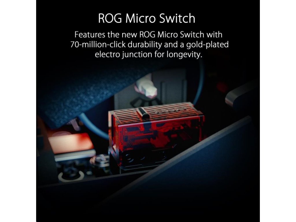 - ROG Micro Switch - ROG Micro Switch je vybavený pozláteným elektrospojom a životnosťou 70 miliónov kliknutí, čo zvyšuje odolnosť a predlžuje životnosť myši. Prísne výrobné štandardy ROG zaručujú, že každé tlačidlo myši si zachováva odchýlku sily v rozmedzí +/- 5 gramov pre konzistentný pocit z kliknutia.