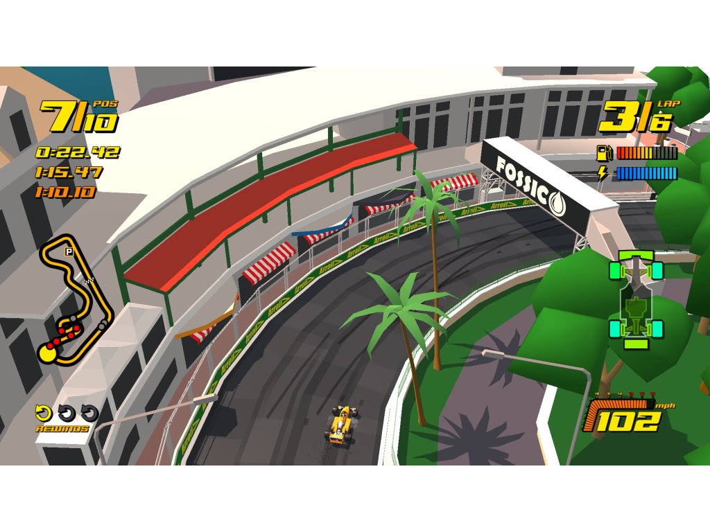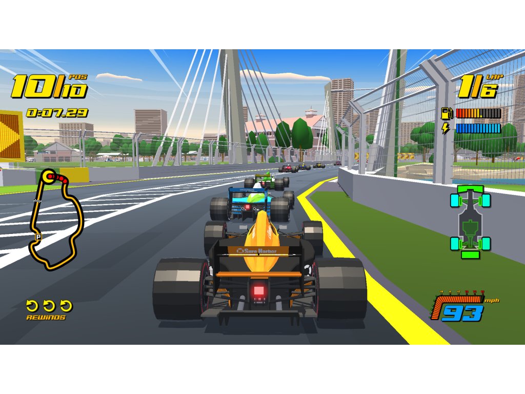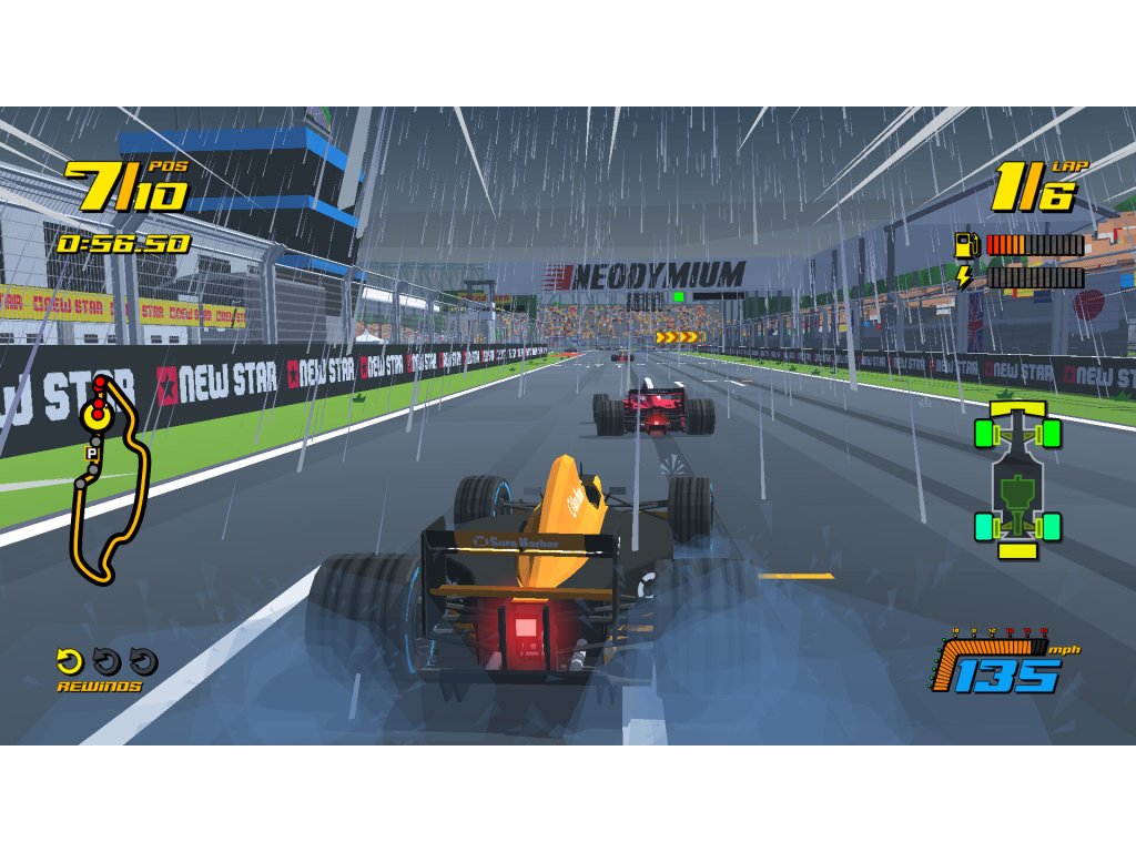 Beautifully rendered retro looks and a driving retro soundtrack that bring back fond memories of the iconic racing games of the 1990s. A pick-up-and-play arcade driving experience that has more depth than you think. While anyone can take the wheel and have success, those who want to truly master the game will want to make use of tyre choice and wear, component reliability, slipstreaming opponents, fuel load, and even pit strategy. Anything can happen in races, from catastrophic component failures and dynamic weather changes, to tyre blowouts and multi-car pileups.