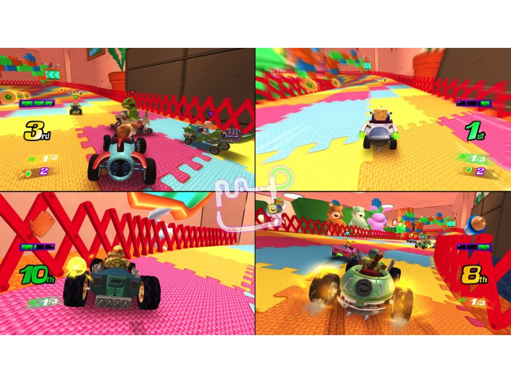 Hit the Slime-filled race tracks with Nickelodeon Kart Racers! Select a racer from one of your favorite Nickelodeon series, including SpongeBob, Patrick, and Sandy from SpongeBob SquarePants, Leonardo, Raphael, Michelangelo, and Donatello from Teenage Mutant Ninja Turtles, Arnold and Helga from Hey Arnold!, & Angelica, Tommy and Reptar from Rugrats. Race your friends in up to 4-player local multiplayer or check out the Battle Arena for a variety of challenges.
