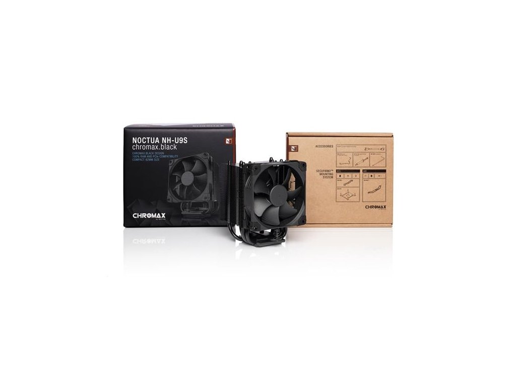 Noctua NH-U9S chromax.black je celočierna verzia úspešného modelu NH-D9S. Táto verzia prináša čierny NF-A9 PWM chromax.black ventilátor a samozrejme kompletne čierny pasív. Noctua NH-U9S chromax.black je vysoko kvalitný, tichý CPU chladič v klasickej 9cm veľkosti. Jeho asymetrický dizajn s 5 heat-pipe trubicami nielen poskytuje ešte lepší chladiaci výkon ako predchádzajúca generácia NH-U9, ale tiež zlepšuje kompatibilitu. Vďaka 95x95mm ohraničeniu, NH-U9S nekoliduje s RAM a PCIe slotmi pri všetkých Intel ITX základných doskách a väčšine AMD založených základných doskách, vrátane µATX a ITX. V kombinácii s jeho výškou 125 mm je Noctua NH-U9S chromax.black vysoko univerzálne riešenie s vynikajúcou kompatibilitou v PC skrinkách, pamätí a PCIe. Súčasťou chaldiča je špičkový NF-A9 PWM Chromax.Black ventilátor, ktorý podporuje automatickú PWM reguláciu od 400 - 2000 RPM/min, pričom L.N.A adaptér vie znížiť maximálne otáčky na 1550 RPM/min.SecuFirm2 ™ spičkový montážny systém, Noctua NT-H1 teplovodivá pasta a plná záruka 6 rokov. Kompatibilita je veľmi široká (pri AMD je nutné, aby základna doska bola osadená (backplate), Intel LGA1851, LGA1700, LGA1200, LGA1156, LGA1155, LGA1151, LGA1150 a AMD AM5, AM4.