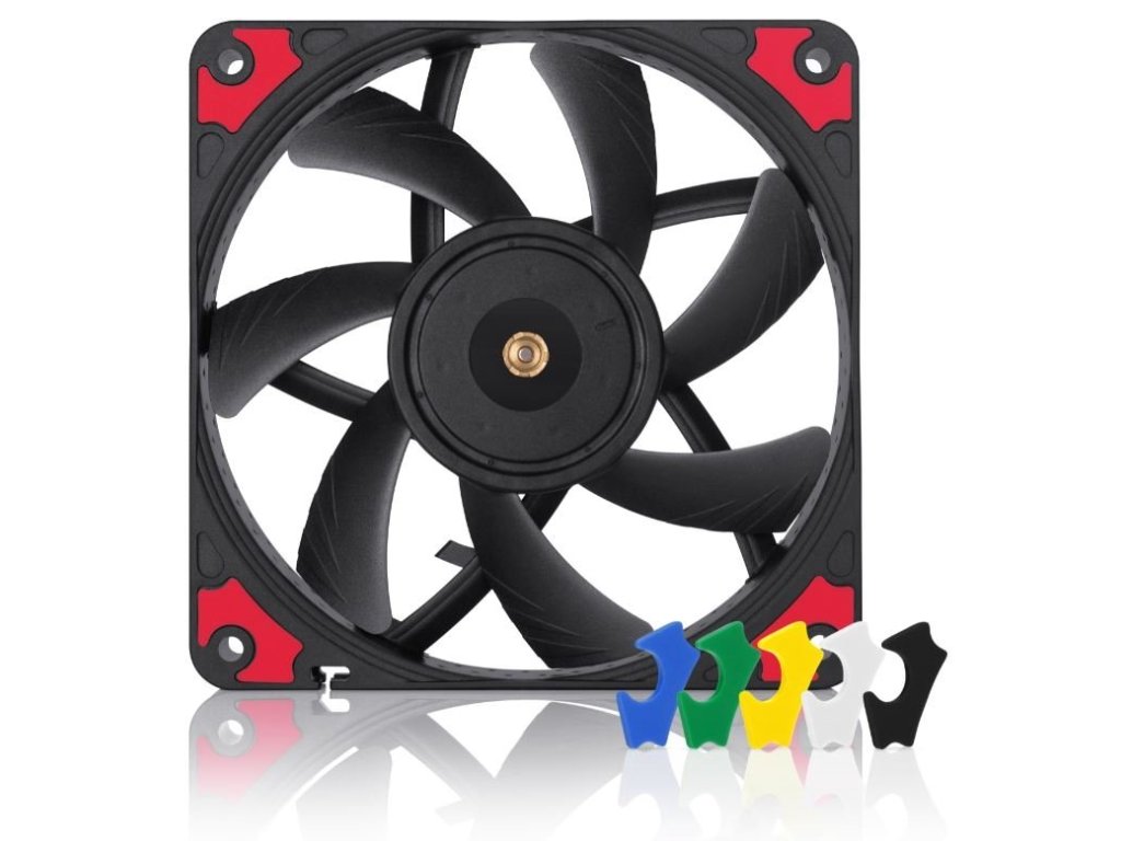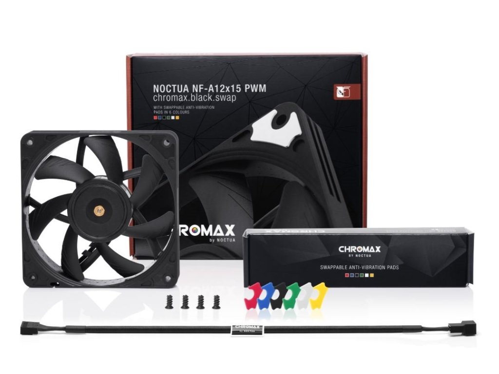 Antivibračné podložky v 6 farbách NF-A12x15 PWM chromax.black.swap je dodávaný s 8 vymeniteľnými samolepiacimi antivibračnými podložkami v čiernej, bielej, červenej, modrej, zelenej a žltej farbe, ktoré umožňujú úplnú farebnú úpravu ventilátora s cieľom koordinácie s inými komponentmi, alebo populárnymi zostavovacími schémami.
