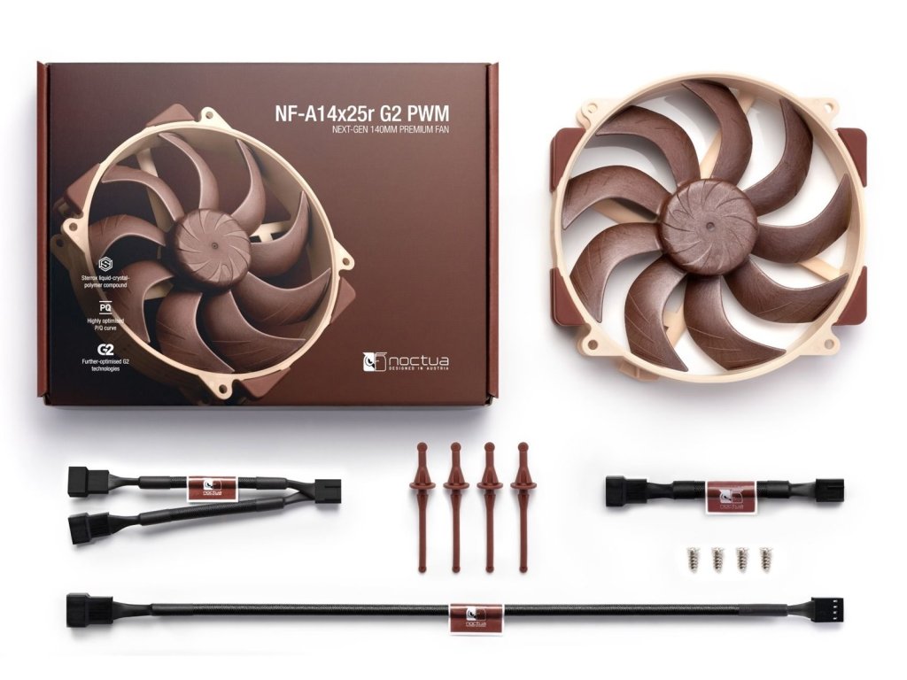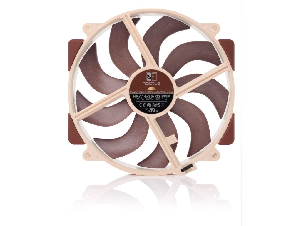 Model NF-A14x25r G2, ktorý je nástupcom oceňovaného modelu NF-A15 a stavia na technologických inováciách prelomového modelu NF-A12x25, je ďalšou generáciou 140 mm vlajkového modelu spoločnosti Noctua s okrúhlym rámom:Vyrobený zo Sterrox® LCP, jeho vysoko optimalizovaný rotor s progresívnym ohybom, krídlami, kanálmi na zrýchlenie prúdenia a nábojom odstredivého turbulátora v kombinácii so svetlosťou hrotov iba 0,7 mm umožňuje modelu NF-A14x25r G2 ďalej zlepšovať preslávený tichý chladiaci výkon jeho predchodcu. Vďaka tomu sa dokonale hodí nielen pre novú generáciu chladičov Noctua triedy 140 mm, ale aj ako vynikajúci upgrade pre existujúce modely chladičov, ako sú série NH-D15(S) alebo NH-U14S (pre konfigurácie push/pull sa odporúča sada Sx2-PP).