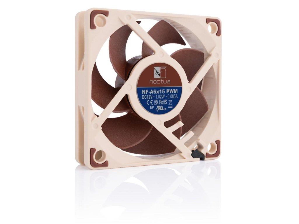 NF-A6x15 je vysoko optimalizovaný tichý ventilátor prémiovej kvality s rozmermi 60x15 mm, ktorý je vybavený pokročilými aerodynamickými konštrukčnými opatreniami, ako sú kanály na zrýchlenie prúdenia a rám Noctua AAO. Verzia PWM využíva špeciálne navrhnutý integrovaný obvod NE-FD1 spoločnosti Noctua na plne automatické riadenie otáčok prostredníctvom 4-pinových záhlaví ventilátora a dodáva sa s adaptérom Low-Noise Adaptor na zníženie maximálnych otáčok počas riadenia PWM z 3500 na 3050 ot/min. Jeho vynikajúca plynulosť chodu, ložisko SSO2 a dôveryhodná prémiová kvalita spoločnosti Noctua z neho robia elitnú voľbu pre najvyššie nároky.Kanály na zrýchlenie toku: Rotor NF-A6x15 je vybavené kanálmi na urýchlenie prúdenia na strane sania. Tým, že toto opatrenie zrýchľuje prúdenie vzduchu v rozhodujúcich vonkajších oblastiach lopatiek, znižuje separáciu prúdenia na strane sania, a tým vedie k vyššej účinnosti a nižšej hlučnosti vírenia.