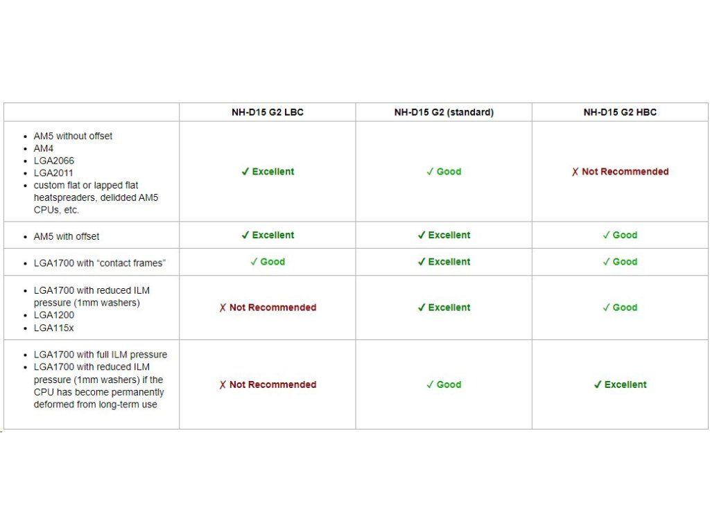 Možnosť posunutej montáže pre AMD AM5 - NH-D15 G2 obsahuje offsetové montážne lišty Noctua pre AM5, ktoré umožňujú inštaláciu chladiča posunutého smerom k južnej strane pätice o 7 mm, čím sa dosiahne lepšia kvalita kontaktu priamo nad CCD. To môže pomôcť verzii LBC prekonať ďalších niekoľko desatín stupňa, umožňuje bežnej verzii dosiahnuť rovnaký výkon ako verzia LBC a stavia verziu HBC do tesnej blízkosti.