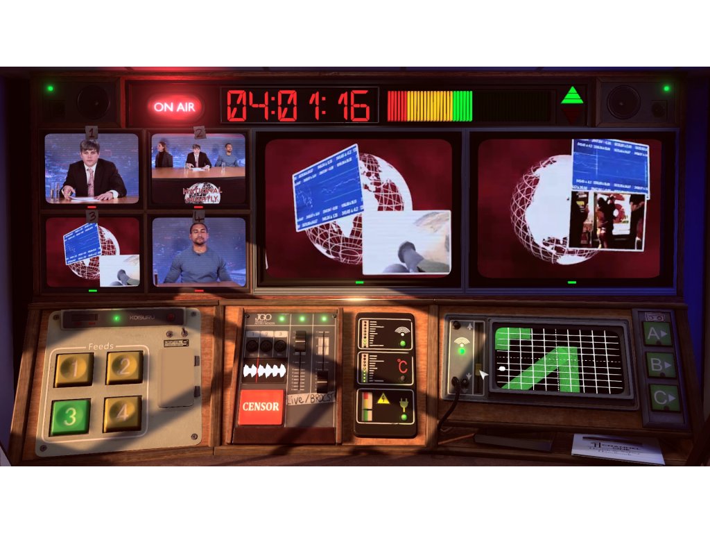 Not For Broadcast is a propaganda simulator developed by NotGames and published by tinyBuild. In this full motion point and click video game it is you who decide what to put on the national TV. You will be responsible for all the information that comes on air. Not For Broadcast is a renowned indie game that has received overwhelmingly positive reviews from both players and game critics.Welcome all of you sitting in front of your TVs. This is the National Nightly News coming to you live from our studios. Thanks for joining us in this full motion adventure full of the latest news, political propaganda, strong emotions and more! Enjoy the story driven experience of a studio director as Alex Winston and control everything that goes live as we all well know that the most important is how you convey the message, and not what really happens…