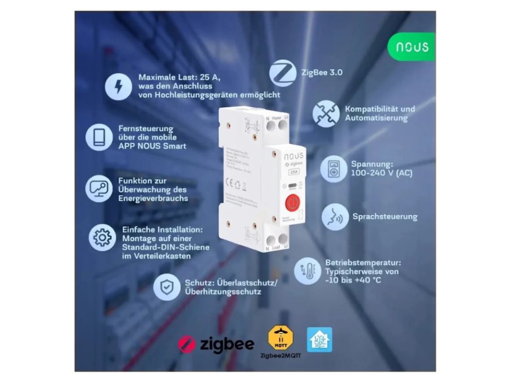 - Diaľkové ovládanie prostredníctvom mobilnej APP NOUS Smart a hlasové ovládanie, vyžaduje sa kompatibilný hub Zigbee
